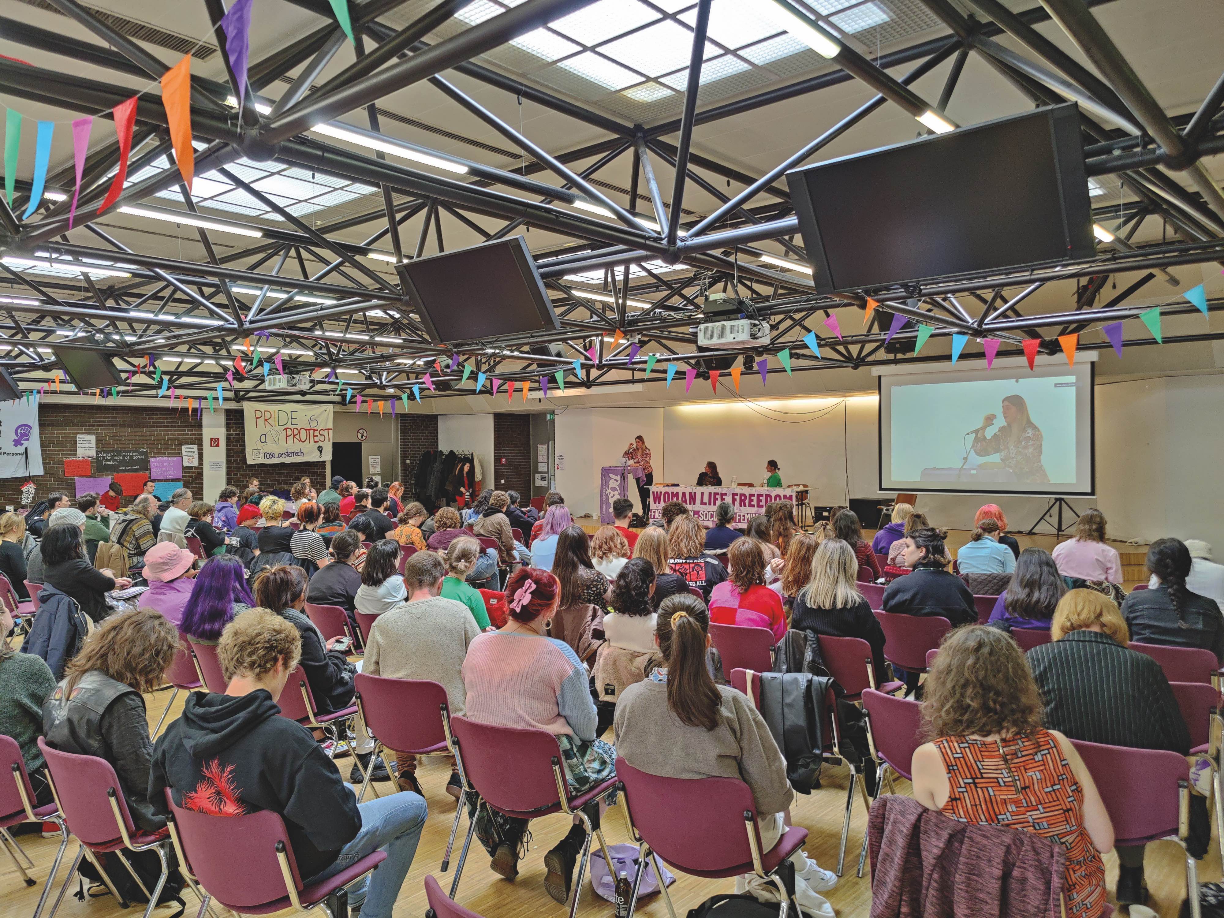 Am 18. und 19. März fand die erste internationale sozialistisch-feministische Rosa Konferenz statt, und zwar in Wien. Anwesend waren knapp 200 ISA- und Rosa-Aktivist*innen aus 20 Ländern (ca. ¼ aus Österreich) wie Brasilien, Israel-Palästina, Indien und Südafrika, und Aktivist*innen aus weiteren 11 Ländern waren über Zoom vertreten. Die Konferenz startete am Samstag mit einem Plenum zum Thema „Frau, Leben, Freiheit weltweit“ mit Rednerinnen aus Belgien, Österreich, Brasilien, Iran und den USA. Abgeschlossen wurde das Plenum mit der Rede von Laura, Gründungsmitglied von Rosa Irland, wo sie die Notwendigkeit aufzeigte, verschiedene Kämpfe zu verbinden, da auch in jeder vergangenen Revolution Frauen und ihre Forderungen eine wichtige Rolle hatten.