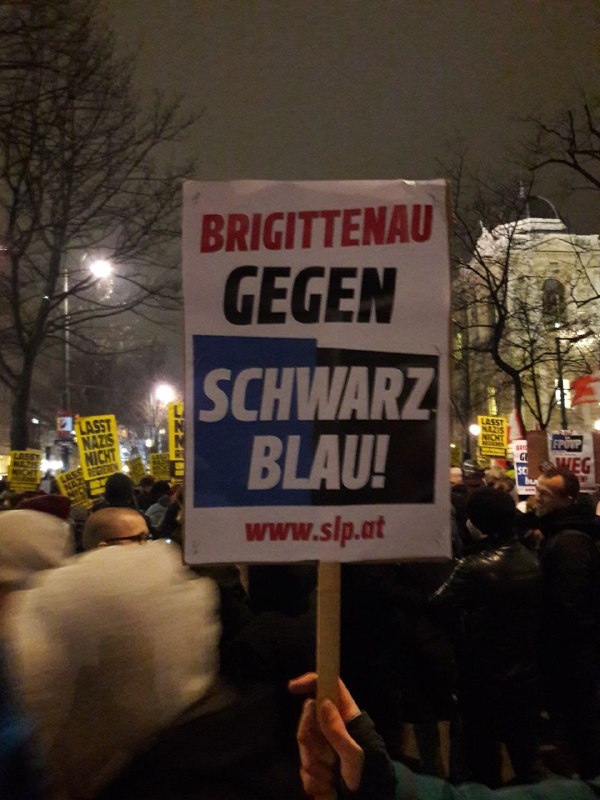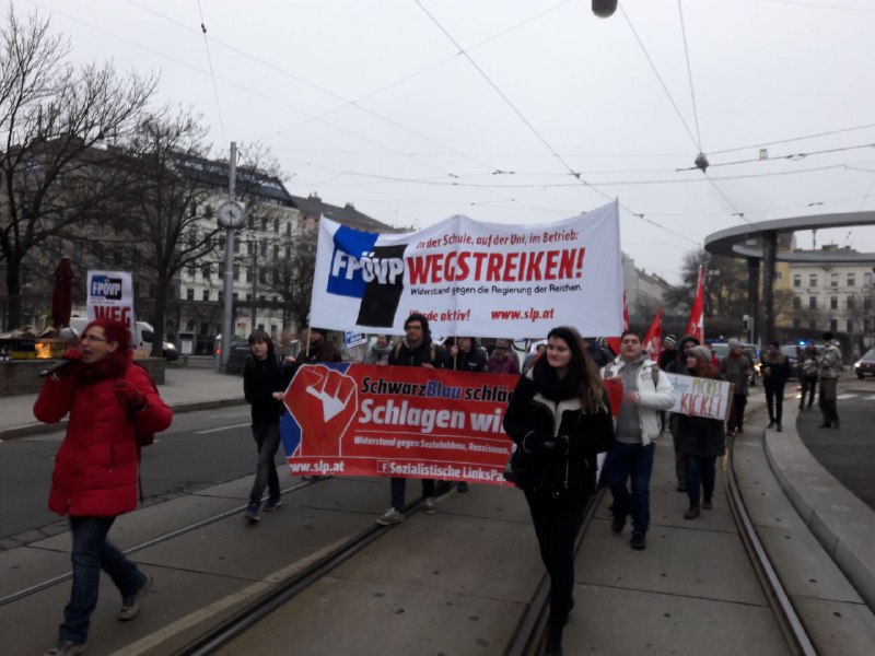 AktivistInnen der SLP bildeten gemeinsam mit der linken Initiative Aufbruch und der RSO (Revolutionär Sozialistische Organisation) einen der kämpferischsten, lautesten und politischten Demoblöcke. Durch Sprüche wie „Rassistisch, sexistisch, neoliberal – FPÖ Partei fürs Kapital“ oder „Was bedeuten Schwarz und Blau – Rassismus und Sozialabbau“ machten wir klar, dass die FPÖ und ÖVP eine Politik gegen die Interessen der Mehrheit der Bevölkerung betreiben. Mit Slogans wie „Nicht aufs Parlament vertrauen – Widerstand von unten bauen“ und „Heute Demo morgen Streik – Widerstand wir sind bereit“ zeigten wir aber auch, dass unser Widerstand nicht beim demonstrieren aufhören darf, sondern wir uns organisieren müssen und die Proteste gegen Schwarz-Blau über Streiks auch in Schulen und Betriebe tragen müssen.