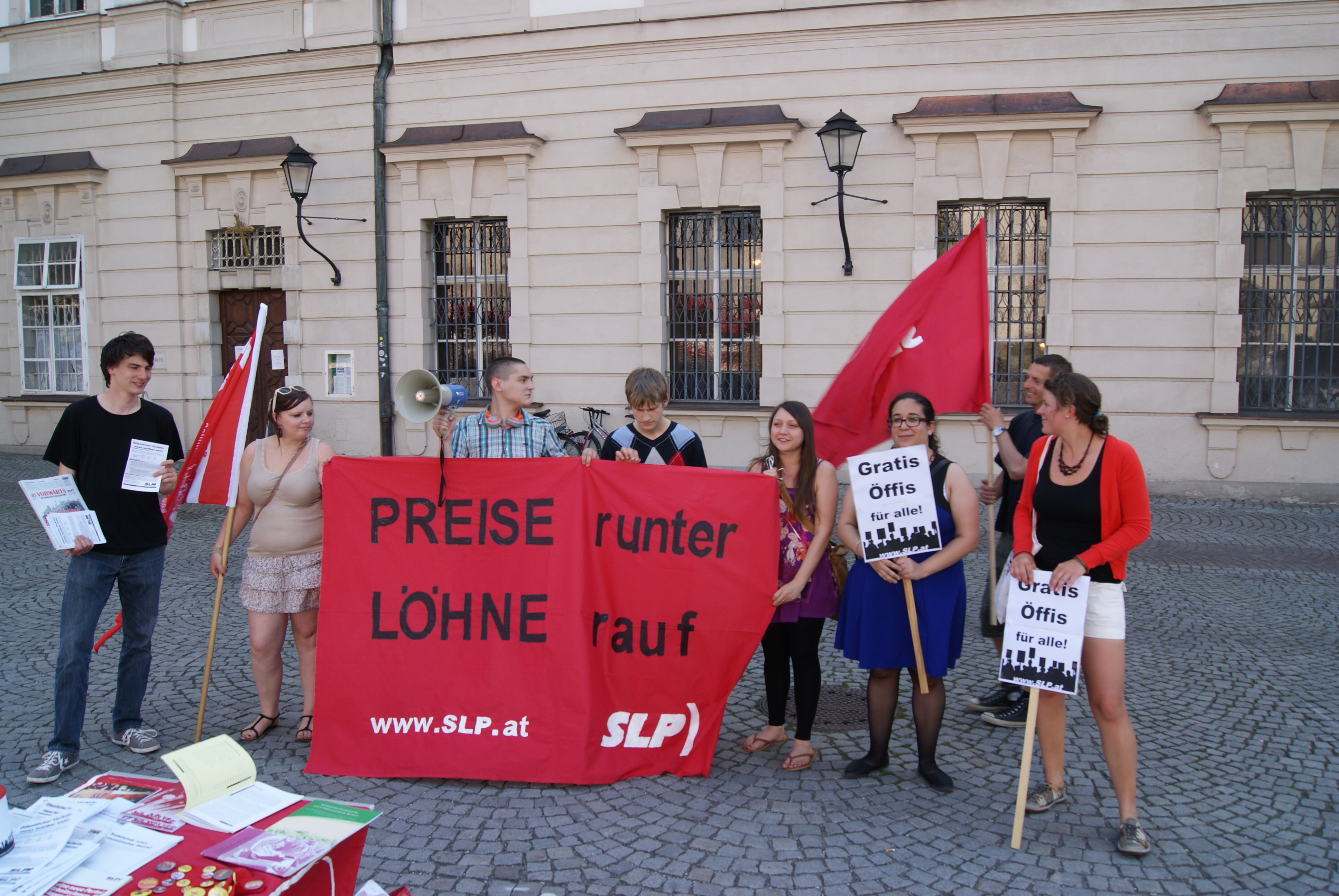 Der öffentliche Verkehr in Salzburg ist der teuerste aller Landeshauptstädte. Das ist zusätzlich skandalös, da der Großteil der Salzburg AG, des wichtigsten Verkehrsanbieters, in öffentlicher Hand ist (42,56 % Land, 31,31 % Stadt). Auf Kosten der Fahrgäste werden Dividenden ausgeschüttet. Dagegen hat die SLP eine Unterschriftenkampagne gestartet, die auf große Zustimmung stieß. 1120 Menschen unterzeichneten. Die gesammelten Protestunterschriften wurden am 17. Juni bei einer Kundgebung an die Verantwortlichen der Stadt übergeben. „Das Leben ist an sich schon teuer genug! Es ist unerträglich, dass hier noch weiter Preistreiberei betrieben wird!“, so SLP-Aktivist Lukas Kastner in seiner Rede, „Das ist ein starkes Zeichen der SalzburgerInnen, dass sie sich das nicht mehr gefallen lassen!“