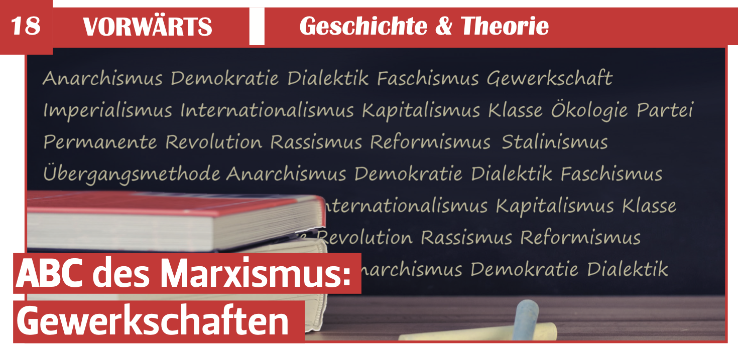 Nicht zuletzt aufgrund dieser Beschränktheit entstanden in der zweiten Hälfte des 19. Jahrhunderts neben den Gewerkschaften Arbeiter*innen-Parteien. Diese führten den politischen Kampf für soziale und demokratische Verbesserungen bis hin zum Sturz der kapitalistischen Gesellschaft. Marxist*innen erfassten dabei die Wichtigkeit der Gewerkschaften als elementare Klassenorganisation: durch den Arbeitskampf lernen die Arbeiter*innen, sich als Klasse mit gemeinsamen Interessen zu identifizieren, erkennen ihren Gegner, erfahren Repression durch den Staat etc. – Klassenkampf als Lehrmeister der Revolution!