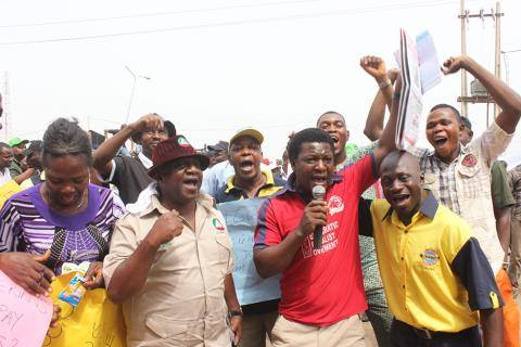Generell haben wir in den letzten Jahren weniger Massenkämpfe als davor gesehen, zum Teil liegt dass an einer neuen, weniger kämpferischen Gewerkschaftsführung. Die ersten zwölf Jahre dieses Jahrtausends sahen eine Serie von Massenprotesten: Neun Generalstreiks fanden statt und vier weitere wurden in letzter Sekunde abgesagt. Manche der Generalstreiks begannen, die Frage nach der Macht zu stellen. Doch seit dem Streik im Jänner 2012 hat die Gewerkschaftsführung es vermieden, generalisierte Aktionen zu organisieren, sogar in der anhaltenden Frage der Nichtbezahlung des neuen Mindestlohns, der 2011 festgelegt wurde. Sie hat auch nur sehr begrenzte, großteils symbolische Aktionen zum Thema von Zahlungsrückständen bei Löhnen und Pensionen organisiert. Die meisten GewerkschaftsführerInnen versuchen, sich mit nationalen und bundesstaatlichen politischen FührerInnen zu verbünden und beschränken sich somit auf gelegentliche kämpferische Aussagen, handeln aber nicht. Zum jetzigen Zeitpunkt sind die Entwicklung von Aktivitäten und Druck von unten der Schlüssel zur Wiederbelebung der Gewerkschaften und zum Beginn von ernsthaften Bewegungen zu den Themen, mit denen die arbeitenden Massen Nigerias konfrontiert sind.