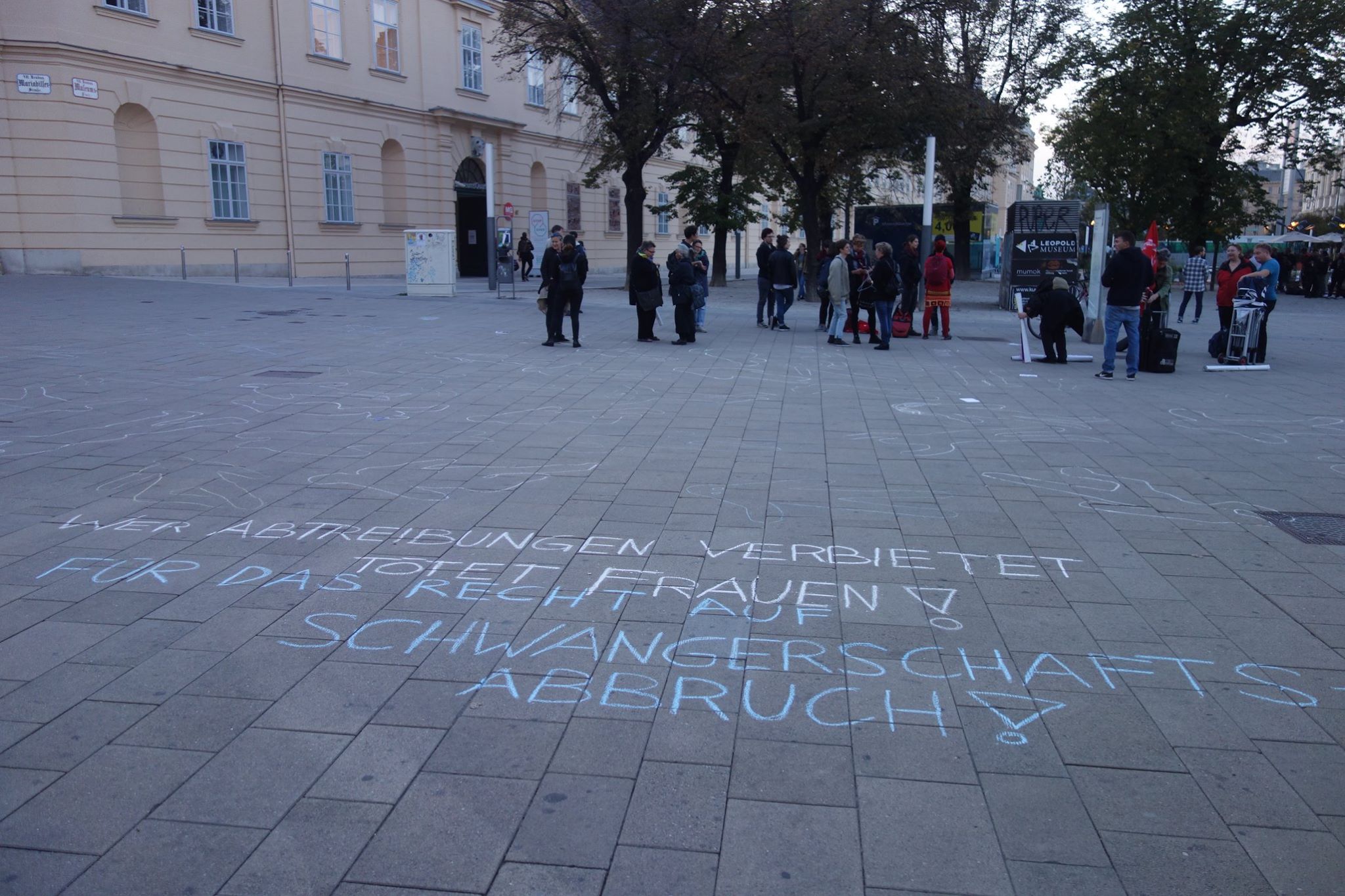 Die Kampagne Nicht mit mir hatte daher die Initiative für eine Protest in Wien gesetzt. Gemeinsam mit Aufbruch wurde zu einer Aktion am 28. September beim Omofuma-Denkmal Ecke Babenbergerstrasse/Museumsquartier mobilisiert. Die Kundgebung selbst gestaltete sich dann sehr bunt: Neben mehreren dutzenden TeilnehmerInnen kamen trotz Wahlkampf VertreterInnen verschiedener Organisationen anwesend um gemeinsam zu demonstrieren und steuerten auch Redebeiträge bei, darunter der Kongress polnischer Frauen in Wien, das Frauenvolksbegehren, 20.000 Frauen, KPÖ+ und natürlich Aufbruch, Nicht mit mir und die SLP. Ein gemeinsames Solidaritätsfoto für die Frauen in Irland, die dort am Samstag den 30. September eine Demonstration für das Recht auf Schwangerschaftsabbruch durchführen wurde gemacht. Und die Umrisse von Leichen wurden mit Kreide auf den Boden gemalt – als Symbol dafür, dass alle sieben Minuten eine Frau sterben muss, weil ihr der Zugang zu sicherer Abtreibung verwehrt wird. Für alle TeilnehmerInnen war klar: es geht nicht nur um das Selbstbestimmungsrecht über unseren Körper, sondern auch um die anderen Angriffe, die von einer künftigen Regierung drohen. Wir werden also nicht das letzte Mal auf der Straße gewesen sein!