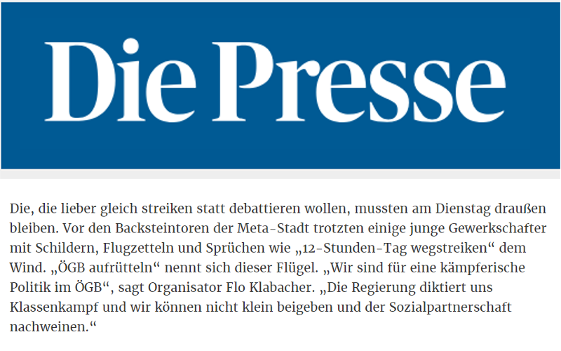 „Die Presse“ berichtete über die Kollektivvertrags-VerhandlerInnenkonferenz des ÖGB – und über die Intervention der von der SLP initiierten Kampagne „ÖGB aufrütteln“. „Wir sind für eine kämpferische Politik im ÖGB“, zitiert sie SLP- und „ÖGB aufrütteln“-Aktivisten Flo Klabacher: „Die Regierung diktiert uns Klassenkampf und wir können nicht klein beigeben und der Sozialpartnerschaft nachweinen.“