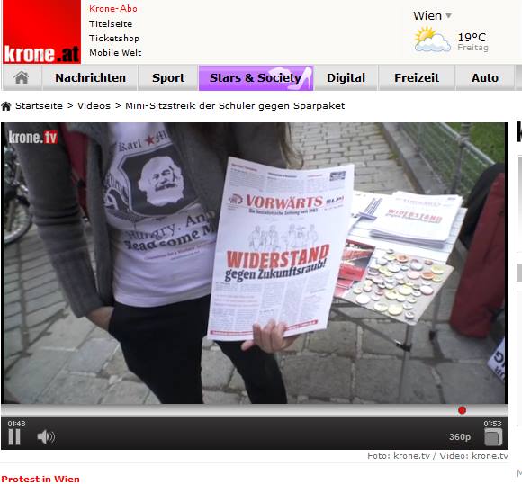 Keine Demo ohne „Vorwärts“! Krone TV berichtete über den ersten Protest gegen die Bildungskürzungen. Die SLP war mit Transparent, Schildern und Infomaterial anwesend. Der „Sitzstreik“ wurde zwar von SJ, AKS & Co organisiert, doch diese hatten weder mobilisiert noch aussagekräftiges Material vor Ort – also wurden wir von oben bis unten abgefilmt und setzten die Initiative zur Gründung von Schulkomitees.