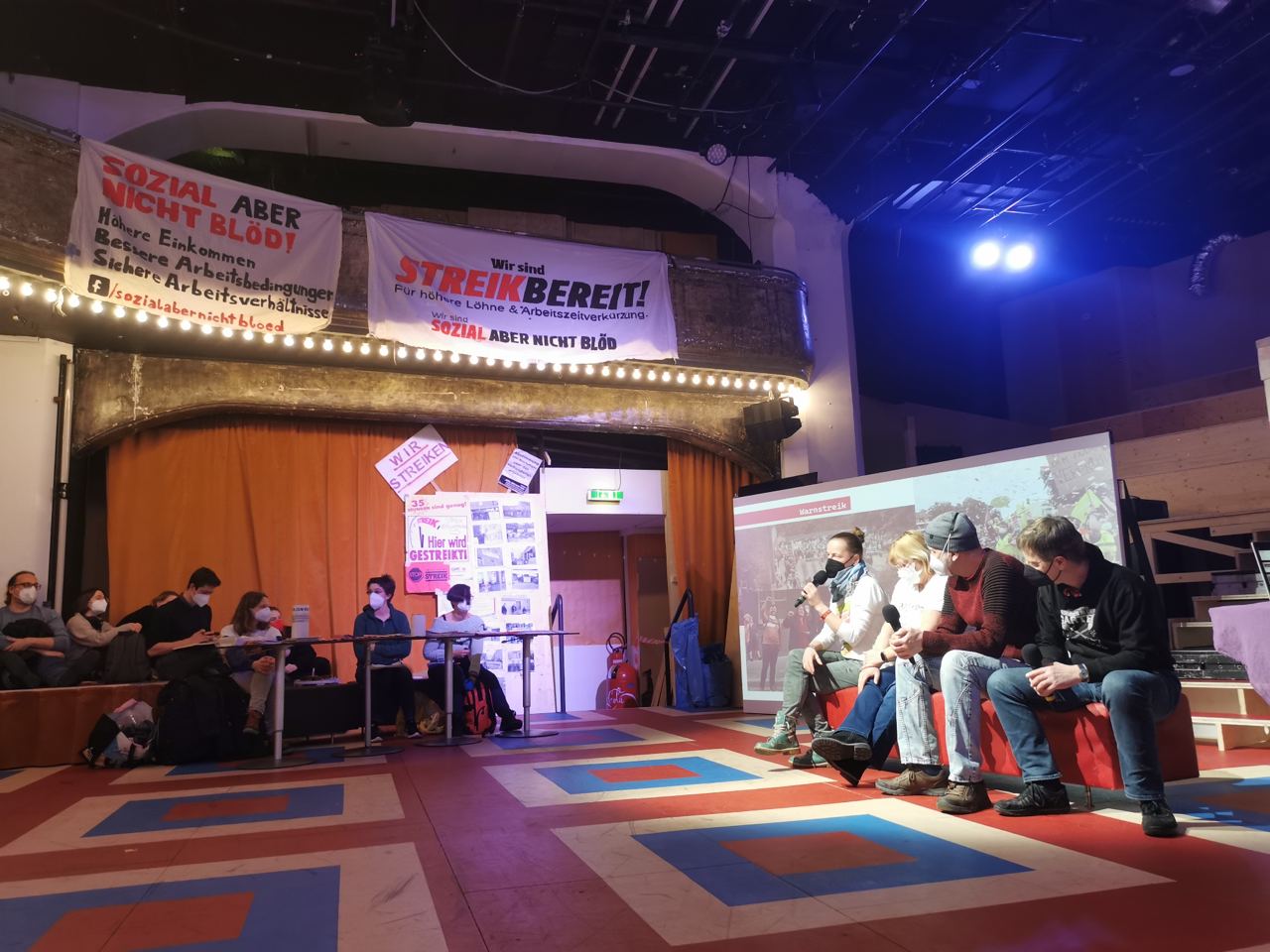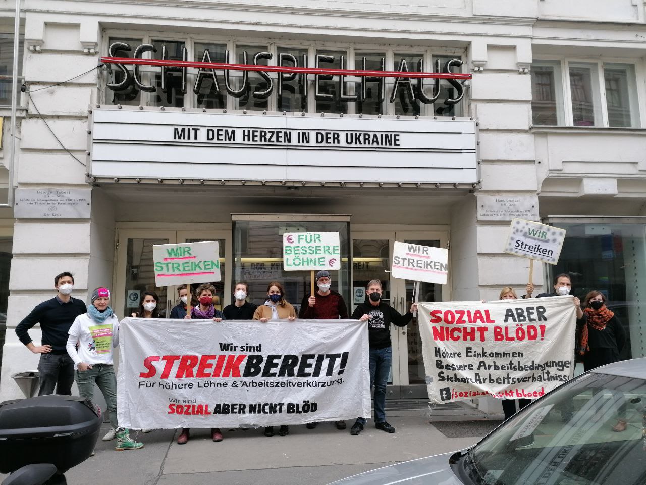 Am Sonntag den 6.3. gab es eine (bis jetzt) einzigartige Veranstaltung. Das Kosmos Theater, das Schauspielhaus Wien und „Sozial, aber nicht blöd“ gestalteten einen Nachmittag im Zeichen der Bewegungen und Kämpfe in der Pflege und im Sozialbereich. Die Veranstaltung fand bewusst am Vorabend des internationalen Frauenkampftags am 8.März statt. Die Idee geht auf eine Berliner Theater – Initiative zurück. Kämpferische und solidarische Schauspielerinnen, Dramaturginnen und Theaterangestellte besetzten die Berliner Volksbühne, und erwirkten unteranderem eine Öffnung des Theaters für soziale Bewegungen. In den letzten Jahren gelang es in verschiedenen Berliner Krankenhäusern (Charite, Vivantes und andere) wichtige Erfolge zu erreichen, etwa die Wiedereingliederung verschiedener Dienstleistungen oder ein Tarifvertrag (Kollektivvertrag) in dem eine bestimmte Mindestbesetzung vorgeschrieben ist. Über Verbindungen zu Theatermenschen und politischen Aktivistinnen in Wien (etwa auch zur SLP), gelang es auch im Wiener Schauspielhaus, die Streiks der letzten Jahre auf die Bühne zu bringen. Am Anfang des Nachmittags stand der Austausch mit extra angereisten Berliner Kolleg*innen, dann gestaltete „Sozial, aber nicht blöd“ einen Streikworkshop zum Schluss des Abends stand der persönliche Austausch beim gemütlichen Beisammensein im Vordergrund. Viele Aktivist*innen der Sozialistischen LinksPartei (SLP) nutzen die Gelegenheit um ihre Erfahrungen einzubringen.