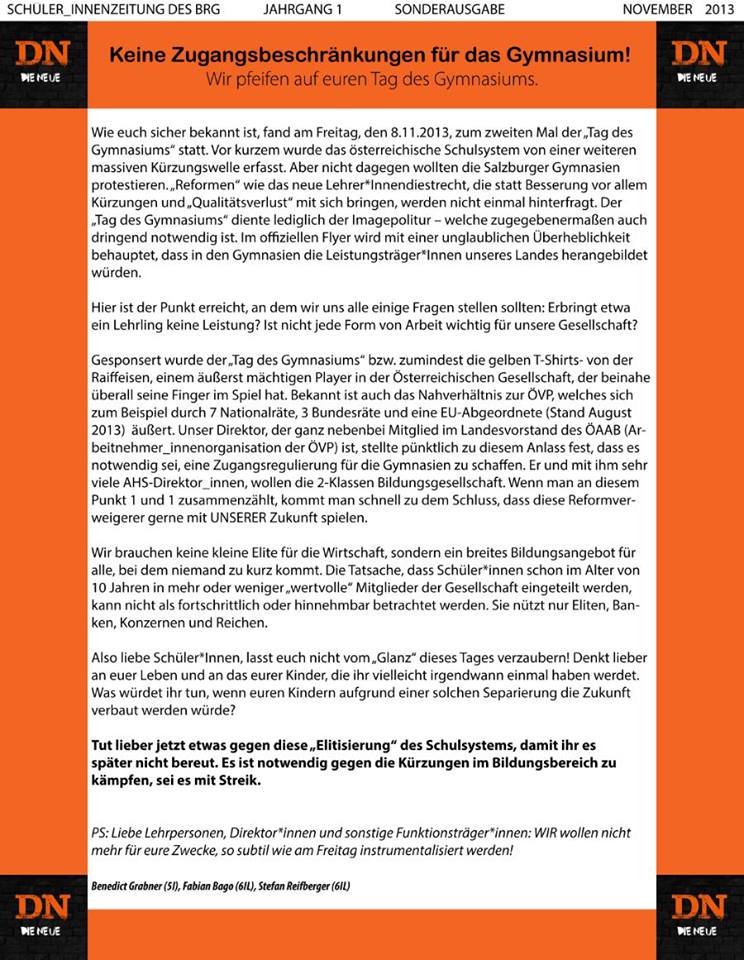 Im täglichen Kampf gegen Bildungskürzungen ist es auch wichtig, ein Organ zur Information der SchülerInnen aufzubauen. Dieses soll und muss widersprechen und polarisieren. In meiner Schule versuchten wir eine solche Zeitung herauszugeben. Sie sollte nicht nur lustige Geschichten aus dem Schulalltag erzählen, sondern die Schulsponsoren (z.B. Raiffeisenbank), Direktorat und Bildungspolitik von einem linken Standpunkt aus hinterfragen und falls notwendig auch anprangern. Daraus haben sich zwei Erfahrungen ergeben. 1) Die Organisation einer SchülerInnenzeitung muss demokratisch verlaufen. Jede/r muss eine sinnvolle Aufgabe übernehmen. 2) „Redefreiheit“ gilt nur, solange sich eine Zeitung an die Vorgaben des Direktorats hält. Doch diesen Vorgaben darf und soll man sich nicht unterordnen.