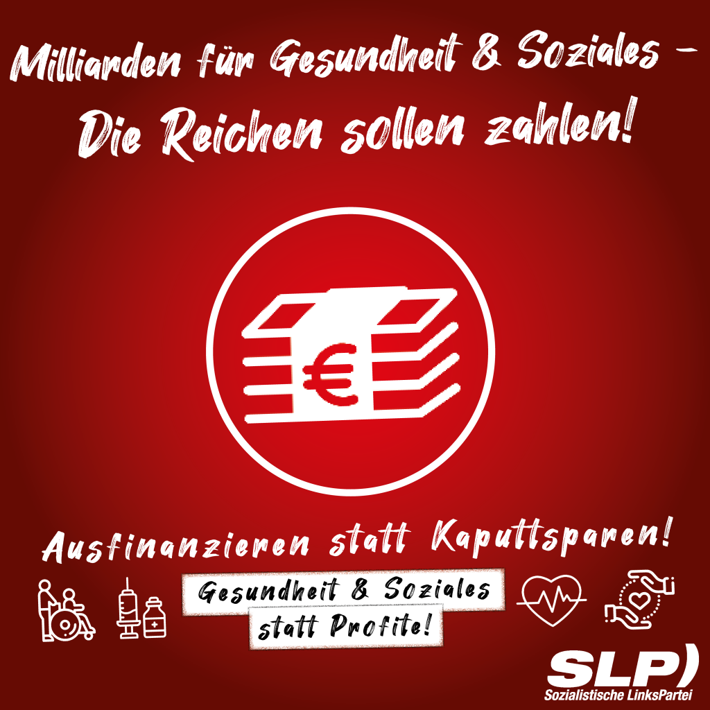Im Kapitalismus kommt Profit immer vor Gesundheit. Der Sozialstaat, den die Arbeiter*innenbewegung in der Vergangenheit erkämpft hat, ist ausgehöhlt. Jede Verbesserung, die wir heute gewinnen, steht morgen unter Beschuss. Durch miese Arbeitsbedingungen, schlechte Wohnungen, verschmutzte Luft und Dauerstress zerstört der Kapitalismus täglich unsere Gesundheit. Deshalb kämpft die SLP nicht nur für unmittelbare Verbesserungen, sondern gemeinsam mit unseren Schwesterorganisationen auf der ganzen Welt auch für eine sozialistische Alternative zu diesem kranken System.