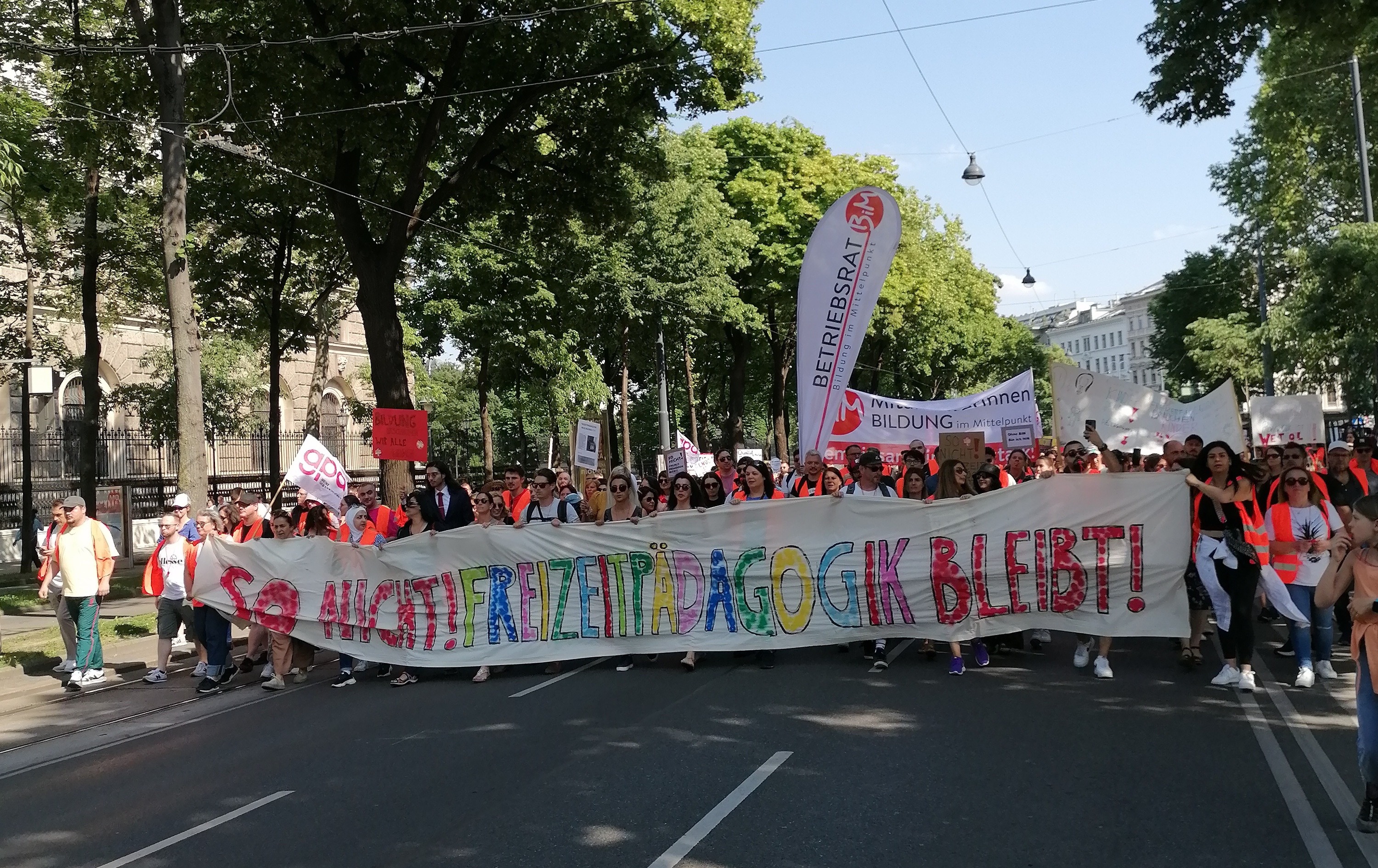 Am 15.6. streiken die Freizeitpädagog*innen in Wien (manche auch länger) gleichzeitig mobilisieren zahlreiche Initiativen aus dem Bildungsbereich für den bundesweiten Aktionstag. Auch in der Erwachsenenbildung und den Unis demonstrieren und streiken Beschäftigte. Lehrer*innen organisieren sich in Basisgruppen. Schüler*innen sind wütend, Eltern auch. Lehrende, Gewerkschafter*innen, Freizeitpädagog*innen, Eltern, Schüler*innen, …. wir alle werden an diesem Tag gemeinsam gegen die Angriffe und für tatsächliche Verbesserungen im Bildungssystem kämpfen.