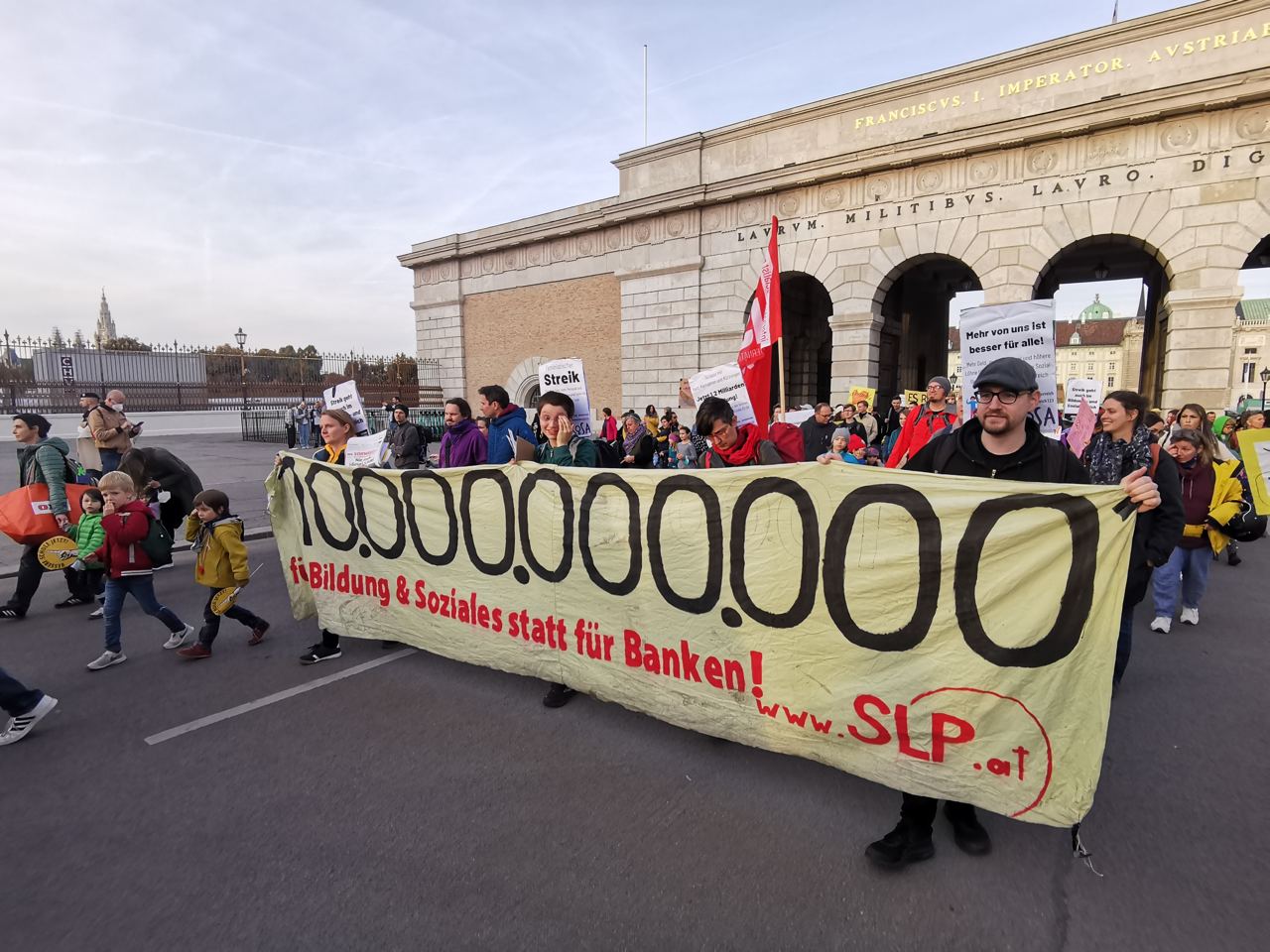 Die SLP hat gemeinsam mit der Initiative ROSA aktiv an den Protesten teilgenommen und war mit einem Transparent, dass “10.000.000.000 für Bildung statt für Banken” forderte, präsent. Dass dieses Banner rund 15 Jahre alt ist, ist nicht weiter aufgefallen, weil das Bildungssystem in Österreich schon seit Jahrzehnten ausgehungert wird. Investitionen in Kindergärten, Universitäten und Schulen werden schon seit geraumer Zeit nicht mehr getätigt, das genaue Gegenteil ist der Fall. In Wien planen NEOS und SPÖ Verschlechterungen im Pflichtschulbereich, die sie als Reform tarnen. Sie beinhaltet eine Ressourcenumverteilung zwischen den Schulen die nur zu einer anderen Verteilung des Mangels führt und darauf basiert, dass Lehrstellen nicht nachbesetzt werden. Die negativen Auswirkungen betreffen in erster Linie die Mehrstufenklassen und die Integrationsklassen an einigen (nicht allen) Schulen Wiens und werden größtenteils erst im Schuljahr 2022/23 schlagend. Die Schulstandorte werden gegeneinander ausgespielt und nicht an allen Orten regt sich deshalb Widerstand. Nichtsdestotrotz versucht die Initiative “Bessere Schule Jetzt” mit wenigen, aber effizienten Mitteln, die Eltern und Lehrer*innen an den Wiener Schulen zu vernetzen und zu mobilisieren, zum Beispiel mit der Aussendung von Elternbriefen über die Elternvereine. Auch Aktivist*innen der SLP sind aktiv und haben z.B. an der Schule ihres Kindes offensiv für die Demonstration mobilisiert, Schaukasten des Elternvereins inklusive.