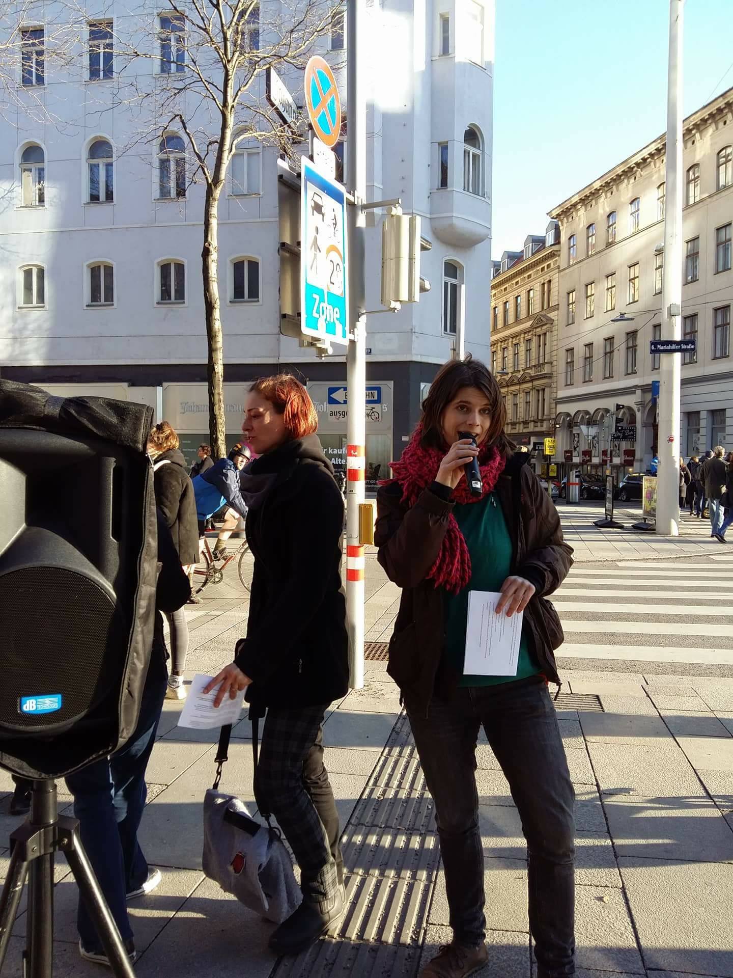 „Nicht mit mir“ organisierte eine Kundgebung auf der Mariahilferstraße in Wien. Aktivistinnen, darunter Betriebsrätinnen und Beschäftigte des Sozialbereichs, hielten Reden. Sie erzählten vom Streik in ihrer Branche, in der überwiegend Frauen für niedrige Löhne und oft in Teilzeit arbeiten. Das Recht auf Selbstbestimmung und die Möglichkeit eines Schwangerschaftsabbruches war ebenfalls Thema einer Rede. Es kam zu zahlreichen Diskussionen mit PassantInnen, die sich auch in Listen eintrugen, um mehr Infos zu bekommen. Die darauffolgende Demonstration war mit mindestens 1.000 TeilnehmerInnen größer als die Jahre zuvor. Gemeinsam mit KollegInnen aus dem Sozialbereich und der Initiative „Aufbruch“ marschierte „Nicht mit mir“ als lautstarker Block mit.