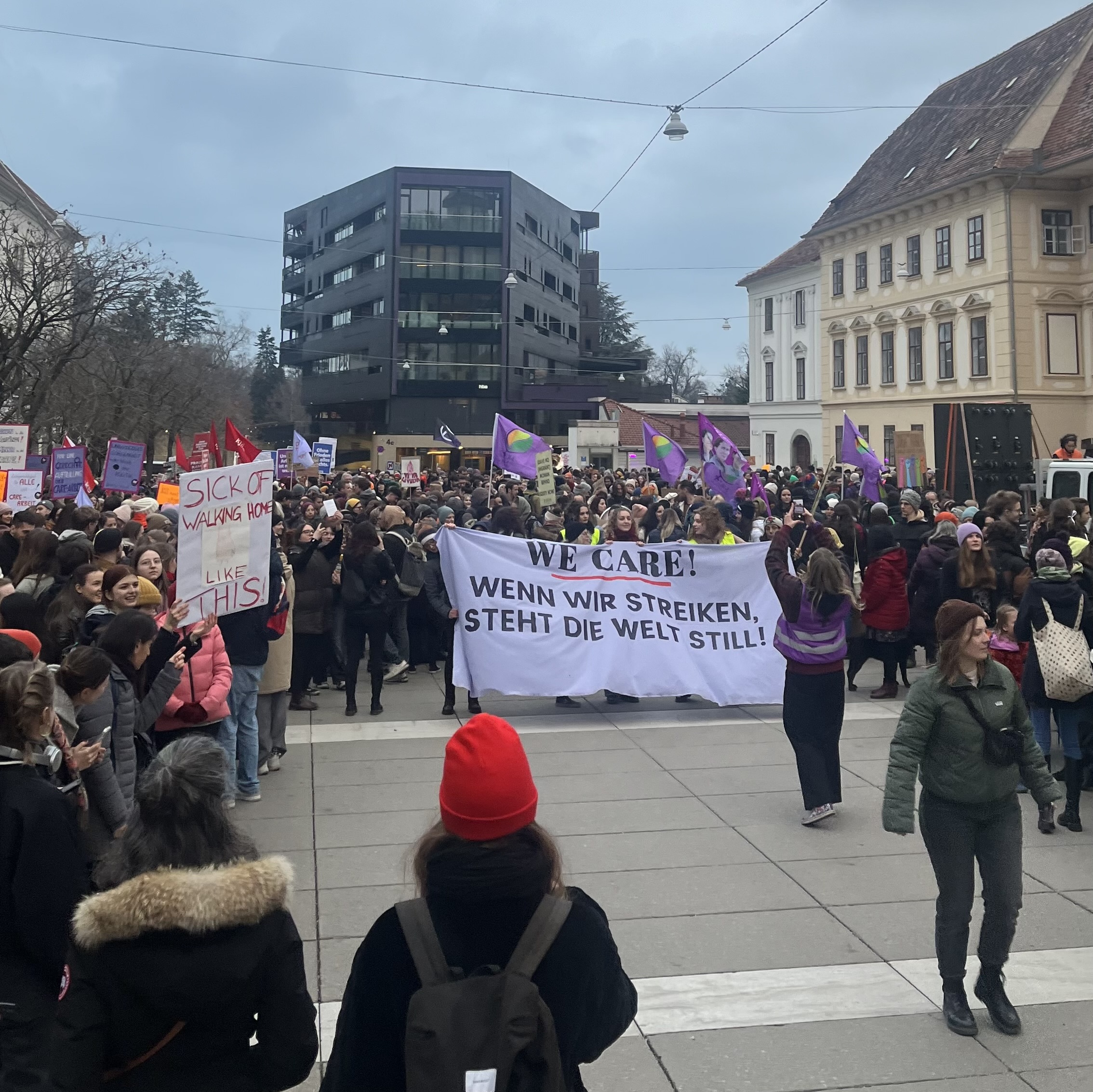 Graz: Die Frage von Care-Bereich und Frauen als Träger*innen der Gesellschaft war sehr dominant. Es war schließlich auch das Motto der Demo: „We care! Wenn wir streiken steht die Welt still.“ Es haben auch einige Beschäftigte aus dem Sozialbereich geredet. Hier wurde das Potenzial eines Streiks im Care-Sektor deutlich - für bessere Löhne und Arbeitsbedingungen, allen voraus Verkürzung der Arbeitszeit bei vollem Lohnausgleich!