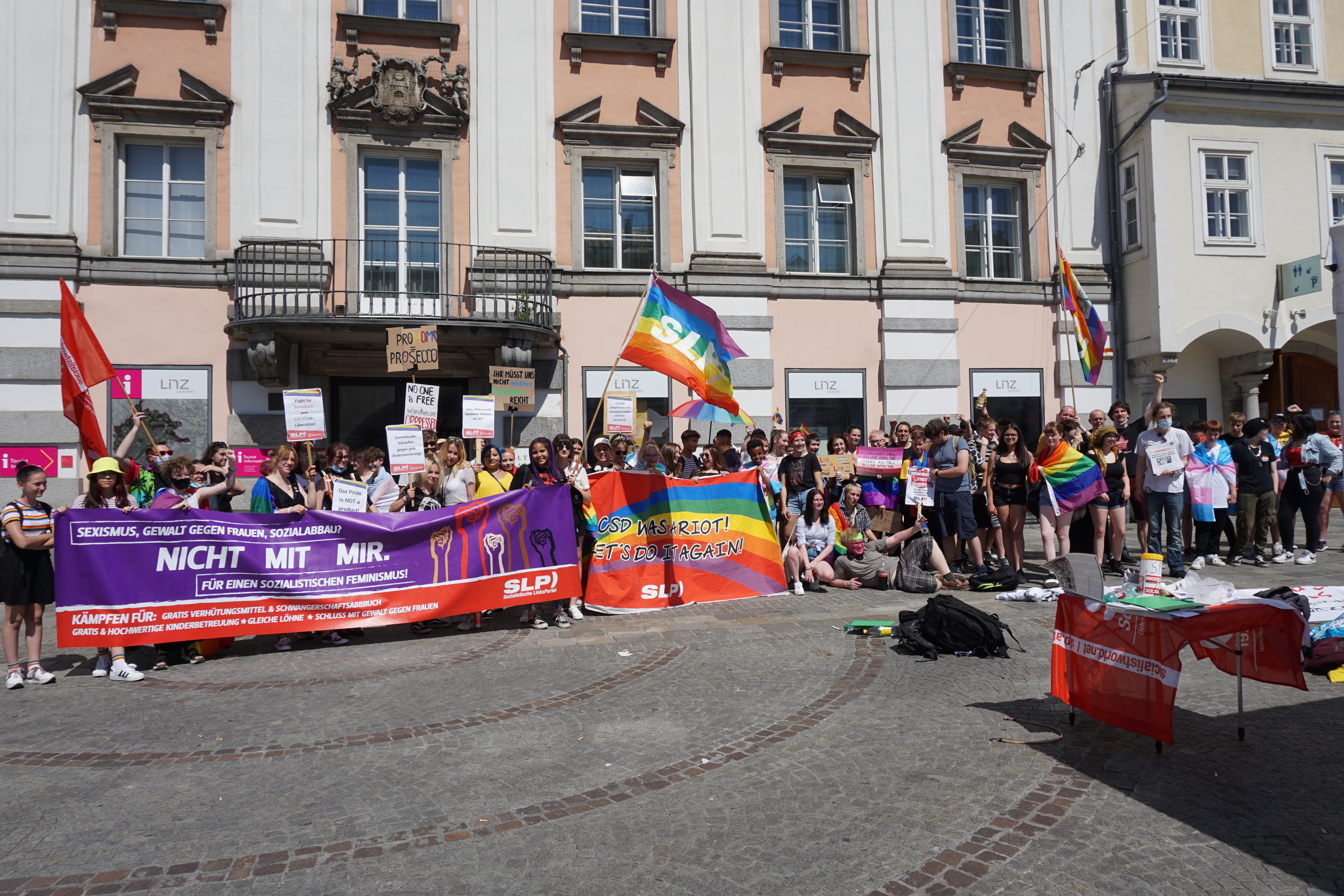 Auch Aktivistinnen des Do It Yourself: Frauentag Linz nutzten die Pride, um ihre Aktivitäten vorzustellen. Mel, eine Aktivistin von YOUnited, hat ein Statement zum Dyke March Linz, also den Marsch am Tag vor der Pride, wo insbesondere auf die Frauen der Community (wie Lesben und Transfrauen) aufmerksam gemacht wird, abgegeben.
