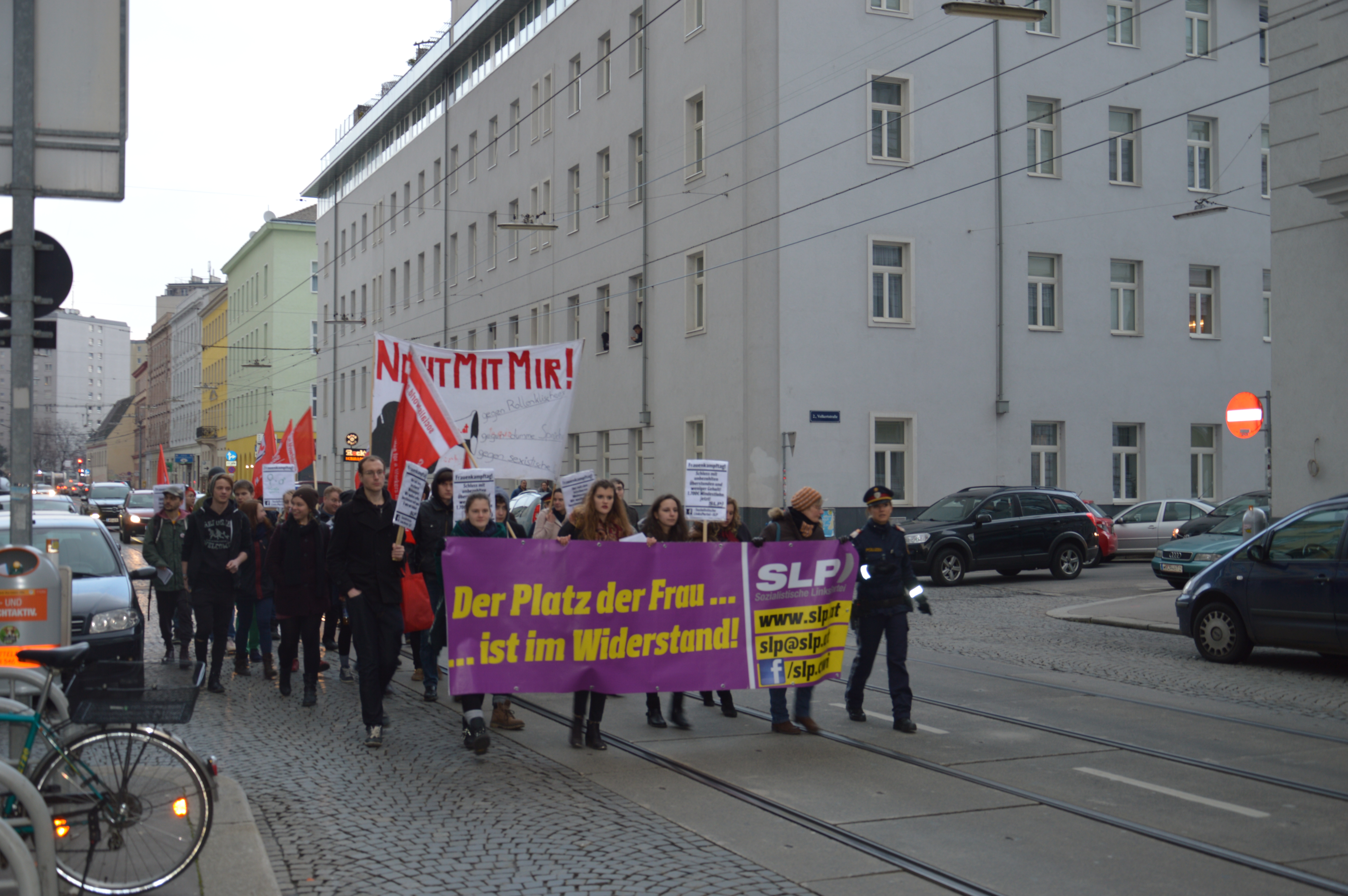Am 8. März, dem internationalen Frauenkampftag, organisierte die SLP auch dieses Jahr eine Demonstration in Wien 20. Lautstark und mit vielen Reden begann die Kundgebung am Wallensteinplatz. Mehrere Rednerinnen der SLP machten klar, dass auch 2016 Frauen nicht gleich berechtigt sind und das auch in Österreich Gewalt gegen Frauen existiert. Die rechten Hetzer, die nach den Ereignissen in der Silvesternacht versucht hatten, das Thema Gewalt gegen Frauen zu besetzen sind jene, die in Wirklichkeit Frauenrechte mit Füßen treten. Von PassantInnen gab es reges Interesse. Ein Bezirkspolitiker der FPÖ drückte sich „unauffällig“ auf der Demoroute herum um Fotos zu machen. Die FPÖ ist jene Partei, aus der es immer wieder sexistische Meldungen gibt oder SpitzenfunktionärInnen, die sich u.a. gegen Frauenhäuser und gegen Abtreibung aussprechen. Im Regelfall verwechselt diese Partei den Frauentag wohl auch mit dem Muttertag...