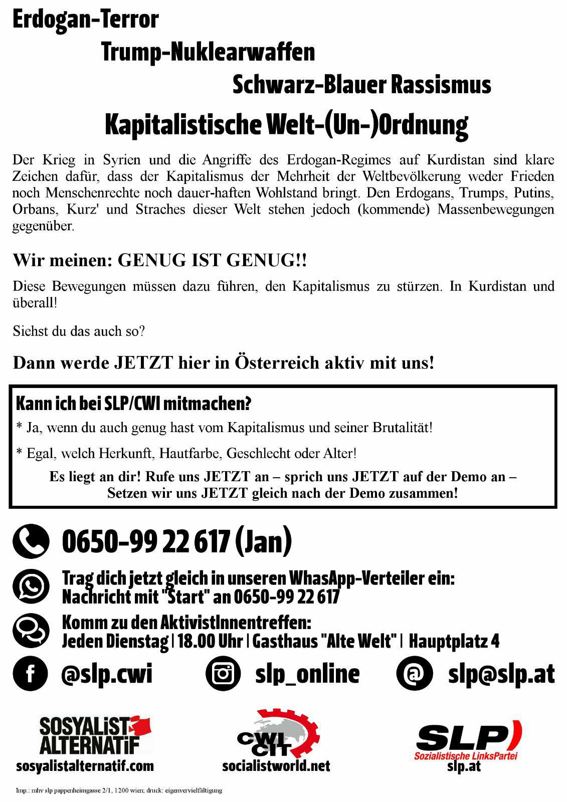 „Das Schweigen der Schwarz-Blauen Regierung zeigt, dass sie in Wirklichkeit kein Problem mit dem Erdogan Regime haben. Ihre populistische Erdogan Kritik nutzen sie nur für billigen Rassismus gegenüber unseren türkischen KollegInnen und FreundInnen während sie und ihre Hintermänner in Industrie und Wirtschaft gleichzeitig beste Geschäfte mit dem Erdogan-Regime machen. Von ihnen können wir uns nichts erwarten. Es gibt nur einen Verbündeten der kurdischen Befreiungsbewegung und das ist die internationale sozialistische Bewegung"