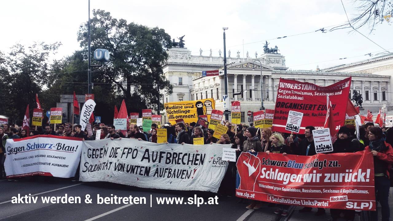 Gleichzeitig ist ein starker Gewöhnungseffekt in Sachen FPÖ im Bewusstsein eingetreten. Längst wurde ihre Politik in mehr oder weniger deutlicher Form von den anderen etablierten Parteien übernommen und auch Koalitionen gibt es in unterschiedlichen Kombinationen auf vielen Ebenen. Nach einer Widerstandsbewegung in der Größe von 2000 sieht es aktuell eher nicht aus. Es kann aber sehr wohl eine Folge von auch erfolgreicheren Mobilisierungen rund um diverse Themen/Angriffsfelder geben. Darauf muss sich die organisierte Linke vorbereiten, wir dürfen uns nicht in Frust oder Selbstmitleid sulen und das Gerede vom „rechten Österreich“ übernehmen. Die kommende Regierung, die etablierten Parteien sind alles andere als stabil und viele von jenen, die jetzt für FPÖ oder ÖVP gewählt haben werden sich in kommenden Bewegungen auf der Straße gegen diese Parteien wiederfinden. Die Erfahrungen der Widerstandsbewegung 2000, die trotz Allem leider nicht erfolgreich war, müssen wir uns vor Augen halten um entsprechend Vorschläge für Programm&Methode einer neuen Bewegung zu machen (siehe dazu mehr unter: https://www.slp.at/artikel/schwarz-blau-droht-%E2%80%93-was-k%C3%B6nnen-...). Unabhängig davon, ob es eine starke Bewegung geben wird oder nicht: Für Einige sind die Wahlen ein Anlass endlich selber aktiv zu werden und sich zu wehren. Aufbruch kann immer noch, trotz der derzeitigen Schwächen, ein Angebot für diese Menschen sein! Aber dafür müssen wir Ideen anbieten und nicht nur diskutieren und wir müssen Aktionen anbieten, die Perspektive geben und nicht nur Selbstbeschäftigung sind!