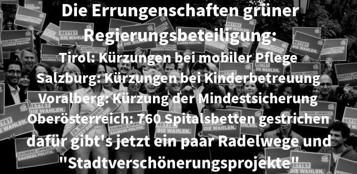 In Tirol und Salzburg sitzen Grüne seit 2013 in der Landesregierung. Von einer sozialeren Handschrift ist dabei wenig zu spüren. 2015 wurden in Tirol erhebliche Kürzungen in der mobilen Pflege alter und kranker Menschen beschlossen. Die weggefallenen Leistungen sollen Angehörige künftig privat bezahlen. In Salzburg wurde 2014 der vom Land gezahlte Zuschuss zur Kinderbetreuung um 50% gekürzt.