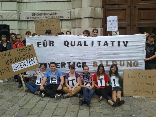 "Wir SchülerInnen zahlen bei der aktuellen Debatte am meisten drauf. Was wir brauchen, sind nicht noch gestresstere LehrerInnen und weniger Ressourcen, sondern mehr gut ausgebildete und gut bezahlte Lehrkräfte, SchulpsychologInnen usw. Wir sind keine manipulierbaren Marionetten, sondern bereit, mit unseren LehrerInnen für Verbesserungen zu kämpfen!" - Stefan Reifberger, AHS-Schüler