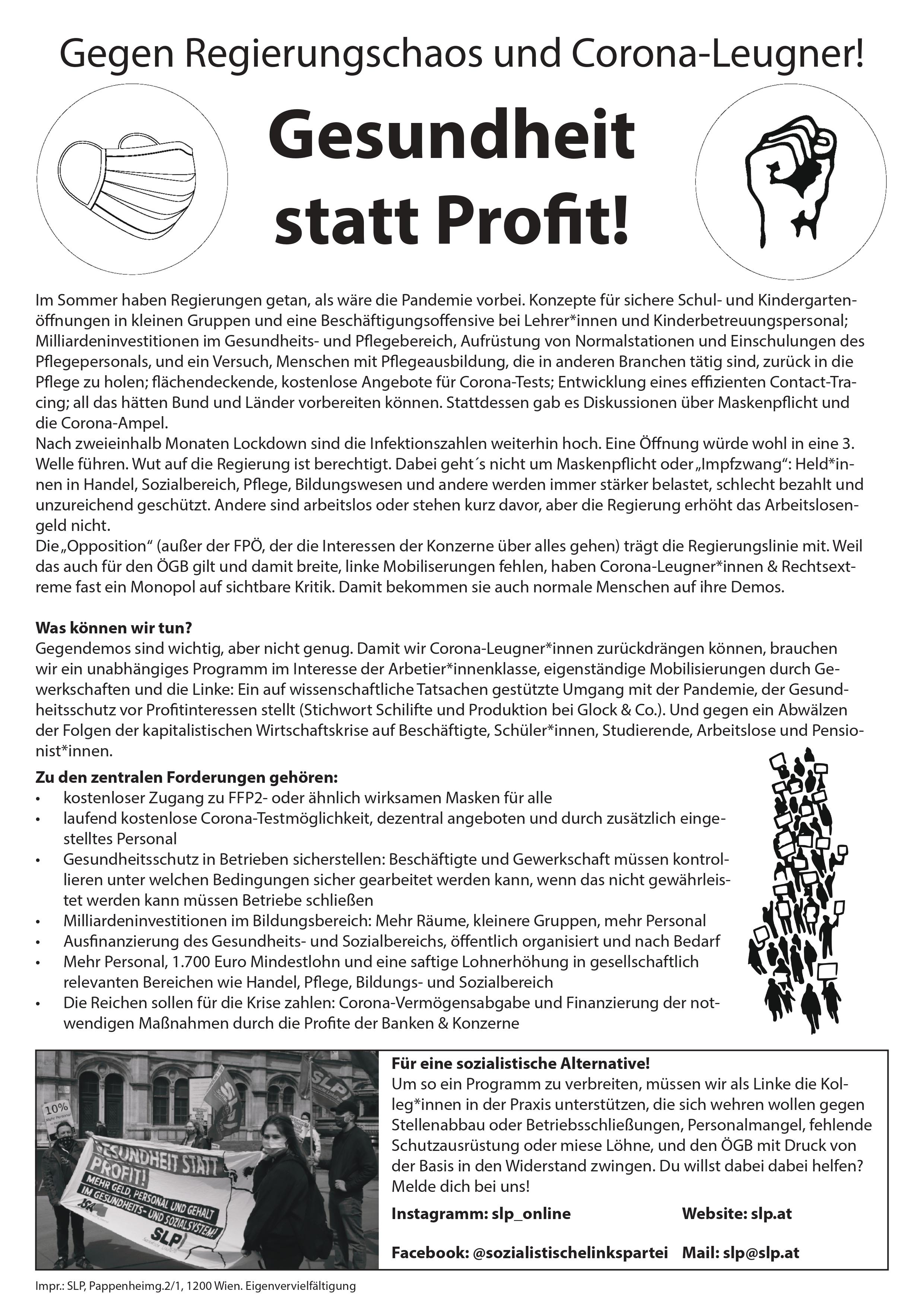 Gegendemos sind wichtig, aber nicht genug. Damit wir Corona-Leugner*innen zurückdrängen können, brauchen wir ein unabhängiges Programm im Interesse der Arbeiter*innenklasse, eigenständige Mobilisierungen durch Gewerkschaften und die Linke: Ein auf wissenschaftliche Tatsachen gestützte Umgang mit der Pandemie, der Gesundheitsschutz vor Profitinteressen stellt (Stichwort Schilifte und Produktion bei Glock & Co.). Und gegen ein Abwälzen der Folgen der kapitalistischen Wirtschaftskrise auf Beschäftigte, Schüler*innen, Studierende, Arbeitslose und Pensionist*innen.