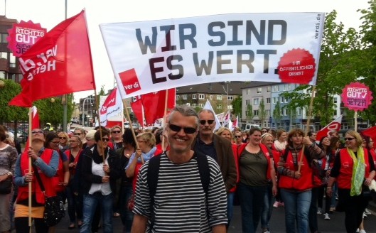 Im Mai und Juni streikten in Deutschland fast vier Wochen lang KindergärtnerInnen, andere PädagogInnen und SozialarbeiterInnen. Gefordert wurde eine 10 % Gehaltserhöhung. Es ging aber auch um mehr Personal und bessere Arbeitsbedingungen. Nach dem riesigen bundesweiten Streik 2009 in dem Bereich, war auch dieser lebendig und aktiv. Mehr als 30.000 KollegInnen demonstrierten in Frankfurt und Hamburg. Es wurden vielerorts demokratische Basisstrukturen aufgebaut und Solidarität unter Eltern und der Bevölkerung aufgebaut, mit Aktionen und Demos.