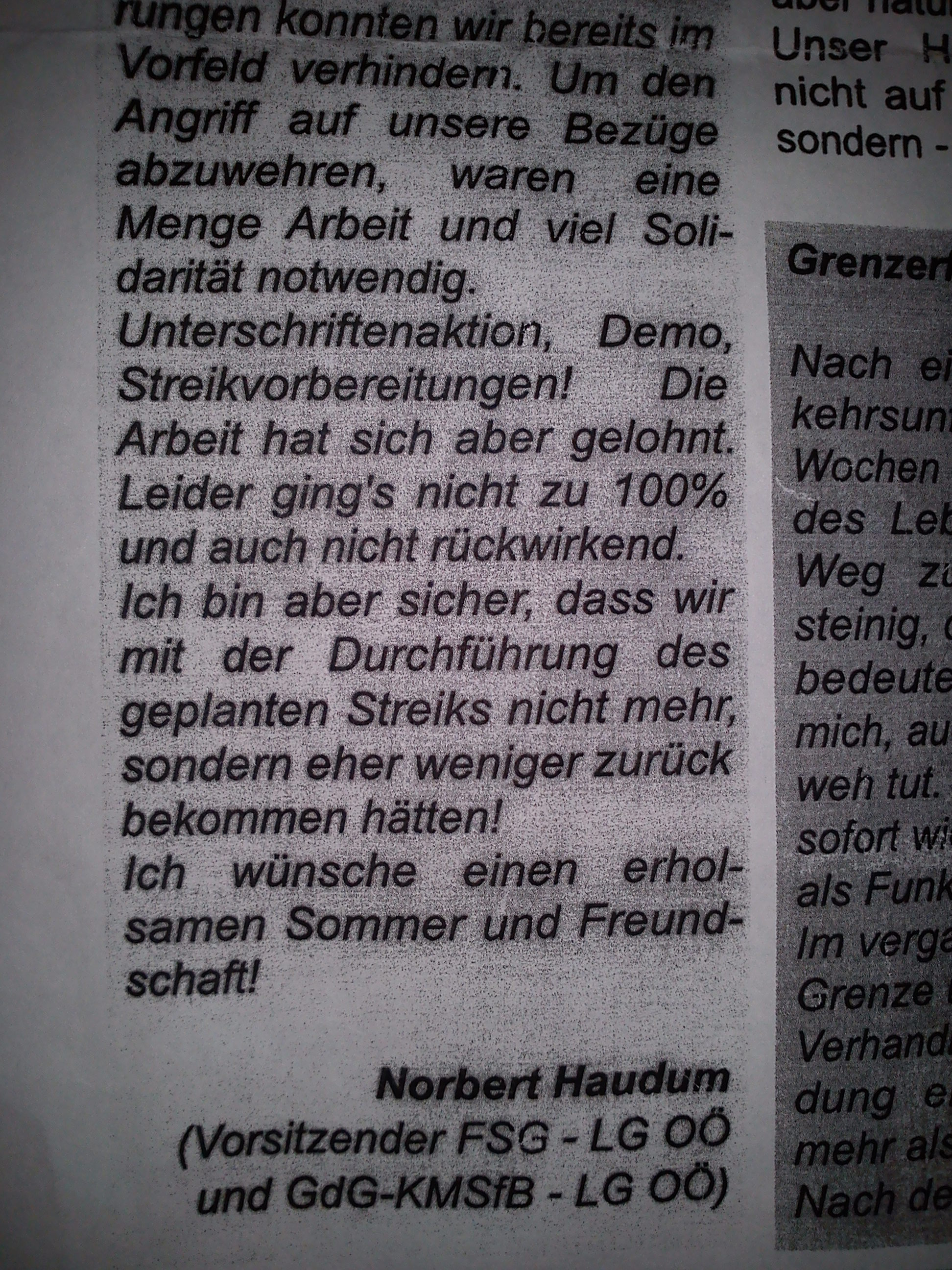 Die Gewerkschaft hat in Oberösterreich einen Streik gegen Lohnkürzungen abgeblasen. Das Verhandlungsergebnis ist mies. Die Belegschaft tobt offensichtlich. Und die Gewerkschaft ist gezwungen, sich mit einem eigenen Flugblatt zu rechtfertigen. Das Geld wäre in Streikmaterial besser angelegt gewesen...