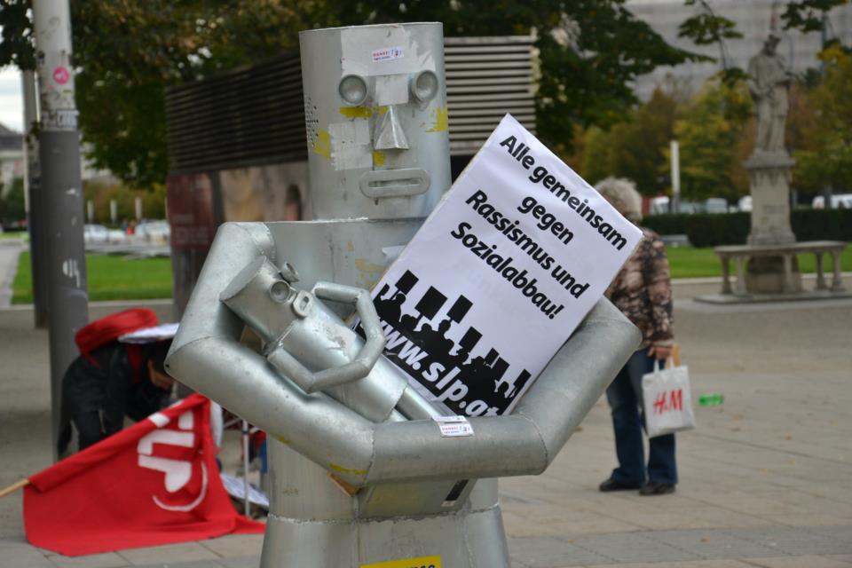 Aber auch in Oberösterreich tut sich was. So organisierte die SLP am 20.9. eine Kundgebung in Linz, um für die Aktionstage zu mobilisieren. Und in Wels beteiligten wir uns vor dem Landesgericht an einer Kundgebung gegen die Abschiebung des kurdischen Aktivisten Ali Yesil in die Türkei.