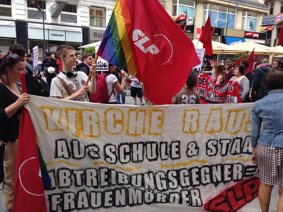 Da wächst zusammen, was zusammen gehört... Katholische FundamentalistInnen marschieren in Wien beim "Marsch für die Familie" u.a. für die Abschaffung des "schamlosen Sexualunterrichtes" (wobei das noch eine der harmlosen Inhalte ist). Es wird auch berichtet, dass sie die Abschaffung des Wiederbetätigungsgesetzes fordern - passend, nahmen doch unter den ca 100-150 Leuten auch eine Gruppe Rechtsextremer aus Polen und der Slowakei teil, die immer wieder hangreiflich gegen GegnerInnen des homophob-reaktionären Aufmarsches wurden. Die Polizei setzte den Aufmarsch mit Gewalt durch, naja das wundert auch niemanden wirklich...