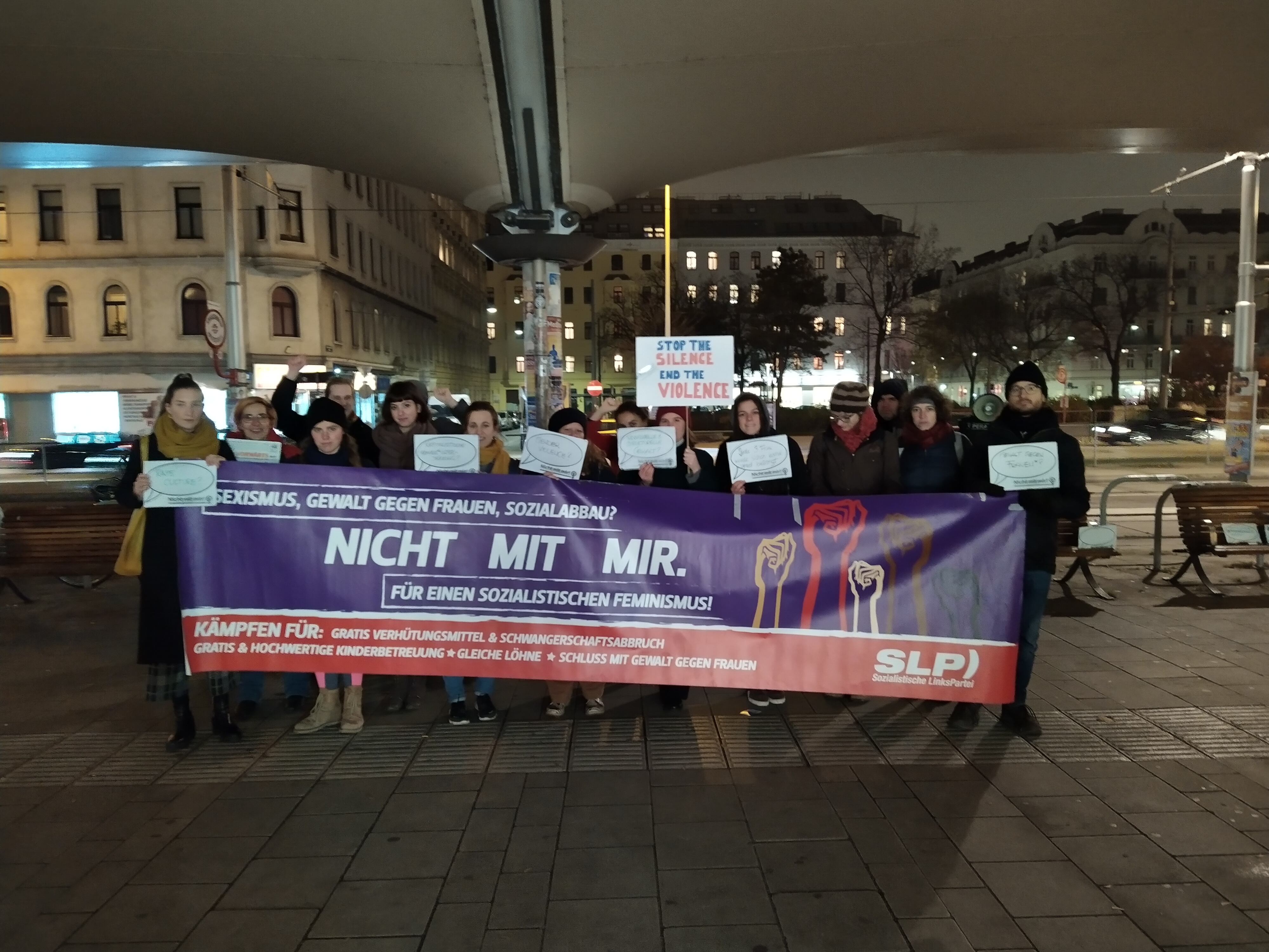 Auch in Wien organisierte die SLP mit der sozialistisch-feministischen Initiative „Nicht mit mir“ am 25.11. eine gut besuchte Kundgebung als ein Angebot zum Widerstand. Mit Schildern und Straßenkreide wurden die gestiegene Anzahl an Frauenmorden, Kürzungen bei Frauenhäusern und -organisationen, sexistische Übergriffe und andere Missstände angeprangert. In Redebeiträgen thematisierten Aktivist*innen unter anderem Gewalt an Transpersonen, den Kampf von Frauen im Nahen und Mittleren Osten und die Notwendigkeit vom gemeinsamen Kampf für soziale Verbesserungen, leistbaren Wohnraum und gleiche Löhne.