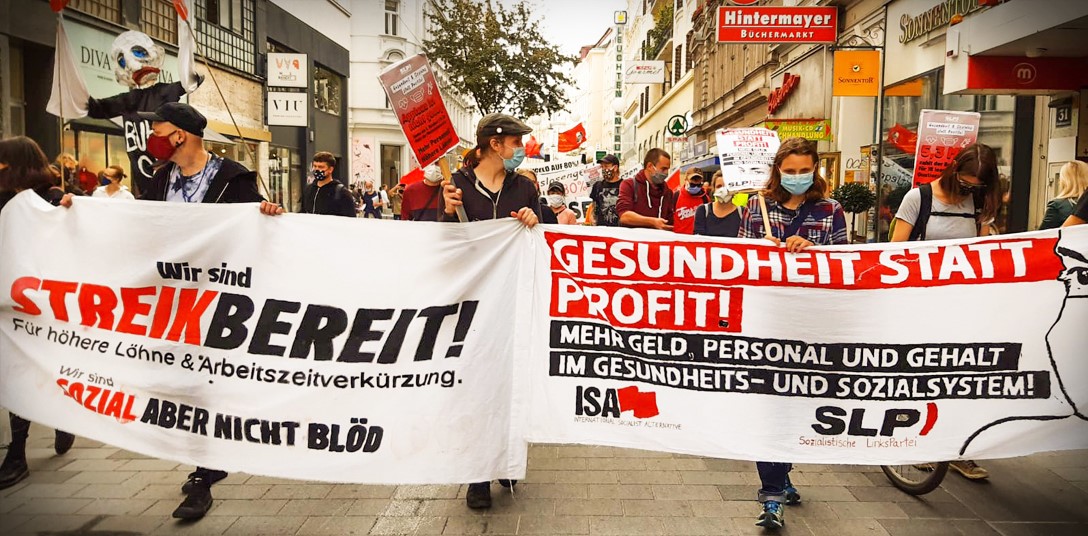 Corona-Sichere Proteste bis hin zu Streiks organisieren für eine Ausfinanzierung des Gesundheitswesens, für mehr Personal im Bildungswesen, für Jobgarantie und Delogierungsschutz für Arbeitslose etc.