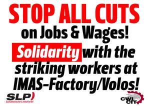 - Zweitens wurde auch über den Streik griechischer ArbeiterInnen in der Contitech/IMAS-Fabrik in Volos berichtet. Dort gibt es Widerstand gegen Stellenabbau und Lohnkürzungen bei den Beschäftigten. In jeder Schicht wird drei Stunden gestreikt, um die Sparpläne des milliardenschweren Konzerns zu durchkreuzen. Wir verwendeten diesen Kampf als Beispiel dafür, wie Widerstand gegen die Sparpläne von Regierungen und Konzernen organisiert werden kann. Eine Solidaritätsbotschaft ging im Anschluss an die Kundgebung an „Xekinima“, die griechische Schwesterpartei der SLP (siehe Bild).
