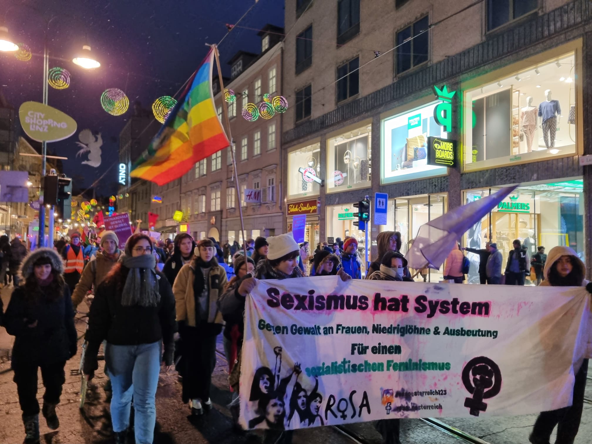 “Gewalt fängt nicht erst an, wenn der Mann zuschlägt.” und “Die meisten Gewalttaten passieren im vertrauten Umfeld wie Zuhause oder am Arbeitsplatz.” Diese Worte von Noushin, die die Demonstration verschiedener Organisationen in Wien mit mehreren hundert Teilnehmer*innen moderierte, machen deutlich, warum ROSA unter dem Motto “Das ganze System ist schuldig” aufgerufen hatte. Viele Redner*innen betonten auf unterschiedlichen Ebenen, wie sehr Gewalt an Frauen und queeren Personen mit einem System der Unterdrückung, Ungleichheit, des Sexismus, Rassismus, Queerfeindlichkeit und Ausbeutung zusammenhängt. Eine Aktivistin von StoP - Stadtteile ohne Partnergewalt brachte auf den Punkt: “Diese Frauenmorde sind nicht nur isolierte Akte der Gewalt, sie sind Symptome eines tieferen systematischen Problems”. ROSA-Aktivistin Chrissi machte in Linz bei der Demo von DIY deutlich: “Der Kapitalismus braucht Geschlechterrollen, um zu funktionieren. Queere Personen werden beschuldigt, das traditionelle Familienbild zu zerstören. Das System braucht es, um die mehrfache Ausbeutung von Frauen und ihre unbezahlte Arbeit zu rechtfertigen.”