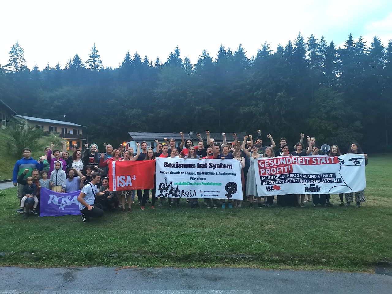 Über 60 Teilnehmer*innen aus Österreich, Deutschland, Rumänien, Israel/Palästina, Irland, USA und Belgien kamen in der vorletzten Augustwoche nach Kärnten/Koroška, um in entspannter Atmosphäre spannende Diskussionen zu führen: Von der Energiekrise über den Ukraine-Krieg bis zur Klimakatastrophe wurden sozialistische Standpunkte debattiert und ausgearbeitet. Zentral dafür waren auch Diskussionen zu historischen Themen wie der Russischen Revolution, um Lehren für heute ziehen zu können. Auch konkrete Initiativen und Kampagnen, etwa im Gesundheits- und Sozialbereich und in der Gastronomie, wurden besprochen und geplant. Geprägt war die Woche insbesondere von der Energie zahlreicher neuer Aktivist*innen und Interessent*innen, die mit der ISA und ROSA aktiv werden wollen. Zwei rote Fäden zogen sich durch alle Diskussionen: erstens die marxistische Übergangsmethode – also die Aufgabe, die notwendige revolutionäre Überwindung des Kapitalismus ausgehend vom jetzigen Bewusstsein und aktuellen Kämpfen und Bewegungen greifbar zu machen; und zweitens der sozialistische Feminismus – also der Fokus auf die besonders wichtige Rolle von Frauen und nichtbinären Personen (aber auch auf die Aufgaben von Männern) in den Kämpfen der Arbeiter*innenklasse. Das Camp war also nicht nur Erholung, sondern vor allem konkrete politische Vorbereitung auf die stürmischen Zeiten, die uns bevorstehen.
