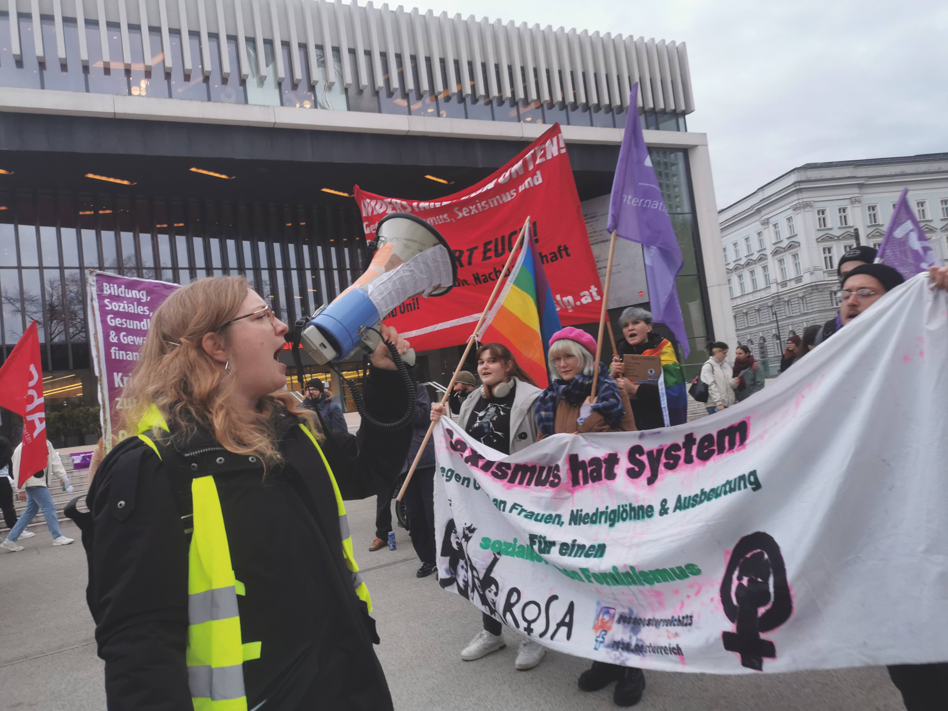 Wir sind auch die restlichen 364 Tage aktiv - und das nicht nur mit Gruppen in Österreich, sondern weltweit: So trafen sich gleich zwei Wochen danach über 200 Aktivist*innen aus aller Welt bei der internationalen ROSA-Konferenz in Wien, um den Aufbau einer globalen sozialistisch-feministischen Bewegung zu diskutieren. Schließ dich dem Kampf an!