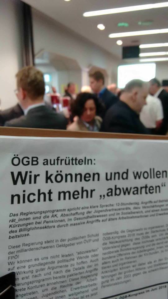Das will die Regierung: Radikale Einschnitte bei lohnabhängigen Menschen, rassistische Spaltung und eine Frauen-zurück-an-den-Herd-Politik. ÖGB und Fachgewerkschaften beschränken sich bislang auf inhaltliche Kritik und Forderungen, die ins Leere gehen. Mit der Kampagne: „ÖGB aufrütteln - Wir können und wollen nicht mehr abwarten“ haben sich kämpferische BetriebsrätInnen/PersonalvertreterInnen und aktive Beschäftigte zusammengeschlossen, um den ÖGB daran zu erinnern was er ist: Eine Kampforganisation aller lohnabhängigen Menschen in Österreich!