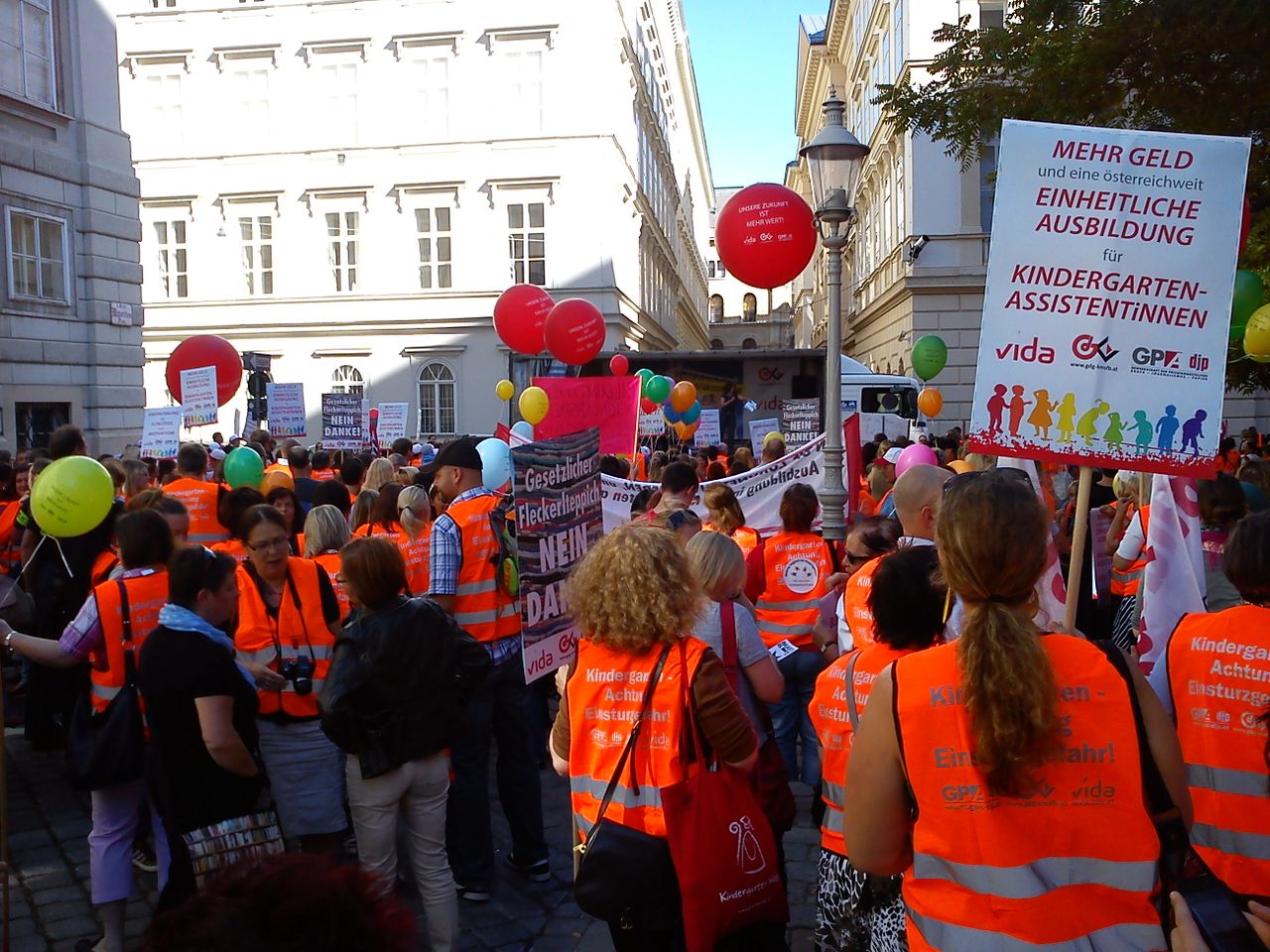 Am Samstag, dem 6. Oktober, fand in Wien eine 4.000 TeilnehmerInnen starke Demonstration der Beschäftigten von Kindergärten und Horts statt. Die Gewerkschaft rief bundesweit dazu auf um von der Regierung höhere Löhne, kleinere Gruppen, mehr Platz und einheitliche Gesetze und Regelungen zu fordern. Es waren Kindergärtnerinnen aus Wien, Niederösterreich, Oberösterreich, der Steiermark und Vorarlberg anwesend. Der Gewerkschaftsführung fiel aber außer Trillerpfeifen nichts anderes ein, um die Demonstration lebendig und kämpferisch zu gestalten - obwohl bei den v.a. Kolleginnen offensichtlich der Wunsch danach da war.
