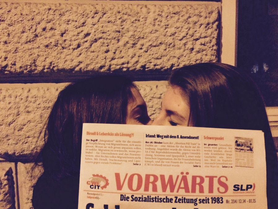 Der Rauswurf eines sich küssenden lesbischen Paares aus dem Cafe-Prückl sorgte für große Aufregung. Zu Recht. Als Reaktion auf die homophobe Diskriminierung wurde am Freitag dem 16.01 zu einer Kundgebung vor dem Wiener Kaffehaus aufgerufen, auch die Sozialistische LinksPartei war vor Ort. Mehrere Tausend Zusagen auf Facebook, sowie eine große Präsenz in den Medien brachten schließlich mehr als 2.000 Menschen auf die Straße um ein Zeichen gegen Homophobie und Transphobie zu setzen! VetreterInnen von SPÖ, Grünen und Neos appellierten scheinheilig an ein weltoffenes Wien in dem die Menschen einfach irgendwann mal „kapieren“, dass Homophobie „einfach keinen Platz haben darf in unserer Regenbogenstadt Wien".