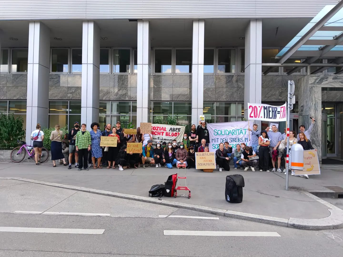 Rund 70 Menschen versammelten sich heute, am 14.06., anlässlich der laufenden KV-Verhandlungen vor dem Ausbildungszentrum Wien um gegen die Arbeitsbedingungen und die Sozialpolitik vom Fonds Soziales Wien (FSW) zu protestieren. Mit Redebeiträgen unterstützt wurde die Kundgebung von Betriebsrät*innen des Neuner-Hauses und dem Verein GIN, der Basisinitiative „sozial aber nicht blöd“, der Initiative Sommerpaket, AG femStreik, der sozialistisch-feministischen Initiative ROSA und der Internationalen Sozialistischen Alternative. Auch ODW-Betriebsrätin Magdalena Zangerl (beratende Stimme bei den KV-Verhandlungen) schaute kurz vorbei, um ihre Solidarität mit dem Protest zu bekunden. Außerdem überbrachte ein Aktivist der kommunistischen Gewerkschaftsinitiative Solidaritätsgrüße von Selma Schacht, der Betriebsratsvorsitzenden von „Bildung im Mittelpunkt“, die gerade für den Erhalt der Freizeitpädagogik im Streik stehen.