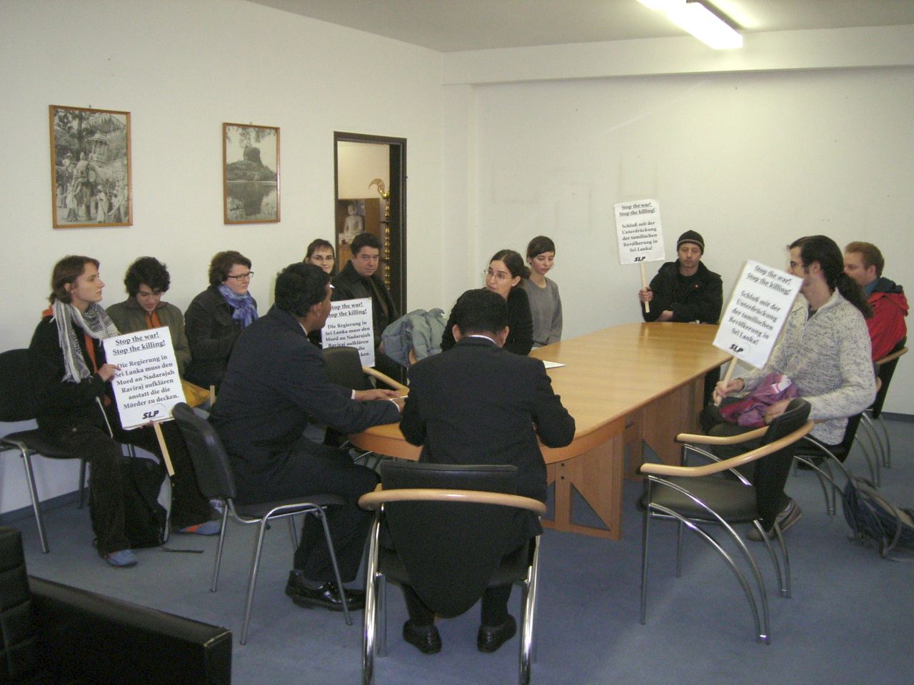 Die AnrainerInnen und PasantInnen wurden per Megafon über den Hintergrund der Kundgebung informiert, die Botschaftsangehörigen erhielten die Infos auch in Englisch. Nach ca. 45 Minuten kamen Vertreter der Botschaft zur Kundgebung und luden und zu einem Gespräch (und Tee) in die Botschaft (ein Vertreter der Stapo hielt es offenbar für notwendig, uns zu begleiten). Nun versuchten der erste und zweite Botschaftssekräter Ransiri Perera und Poshitha