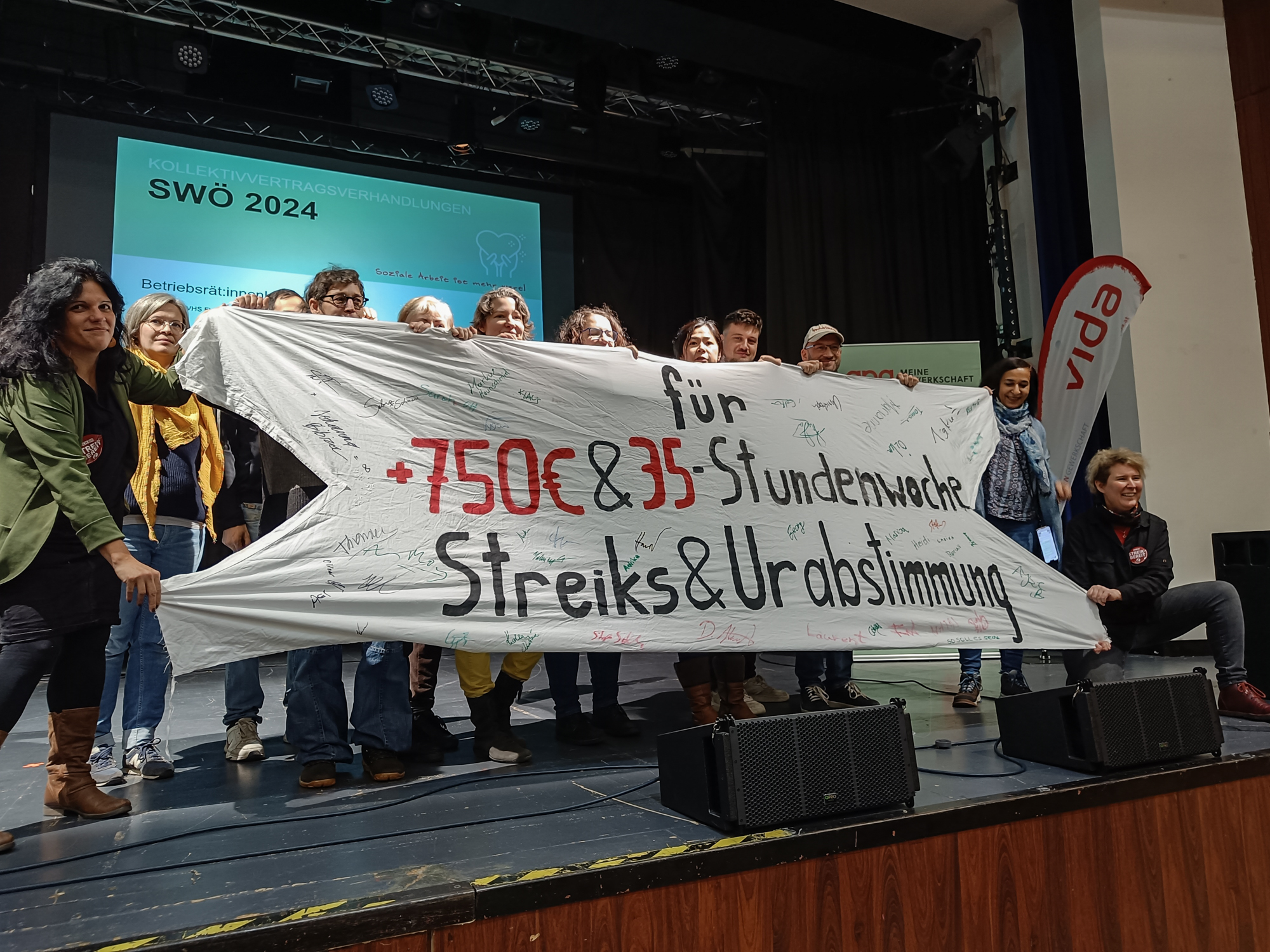 - die Durchführung einer Urabstimmung über den SWÖ-KV-Abschluss (das bedeutet, dass die betroffenen Beschäftigten in Betriebsversammlungen und anderen Foren über ein vorläufiges Verhandlungsergebnis beraten und diskutieren können und auf dieser Basis darüber entscheiden, ob ein Angebot angenommen werden soll bzw. darüber wie weiter für Verbesserungen gekämpft werden soll)
