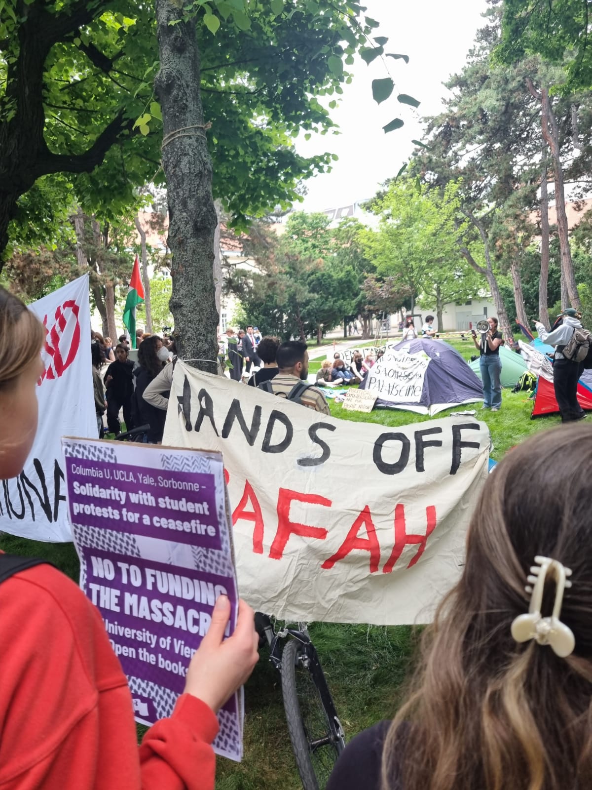 "Als Mittelschullehrerin möchte ich meinen höchsten Respekt und Solidarität mit dem Camp im Alten AKH ausdrücken. Seit Monaten sehen wir wie in Gaza Kinder bzw. Schüler*innen und Lehrer*innen aus ihren Schulen gebombt werden und ihnen jede Möglichkeit von Bildung und oft auch ihr Leben genommen wird.