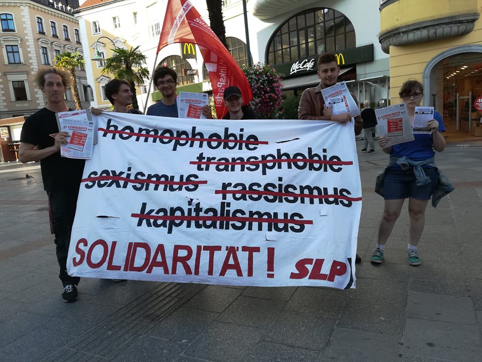 In den letzten 50 Jahren wurde eine Menge erkämpft. Und dennoch: Weltweit steigt homophobe und transphobe Gewalt wieder an. In Frankreich erreicht sie ein Rekordhoch. Das zeigt, dass auf Staat und Polizei kein Verlass ist. Dass die gleichgeschlechtliche Ehe in Österreich von der Justiz eingeführt werden musste, weil FPÖVP diese im Parlament bereits zwei Mal blockiert hatten, zeigt auf zynische Weise, dass selbst grundlegende Menschenrechte im „modernen“ Kapitalismus des 21. Jahrhunderts nach wie vor erkämpft werden müssen und keine Selbstverständlichkeit sind. Lieber halten FPÖ und ÖVP an einem reaktionären Weltbild mit klaren Rollenbildern und an der bürgerlichen Kleinfamilie als Ideal fest: Die Frau als liebende Mutter und Hausfrau; der Mann als Oberhaupt und Ernährer der Familie. Gleichzeitig schmücken sich große Konzerne wie Google, Amazon, Facebook oder Microsoft mit dem Label der Vielfältigkeit (Diversität) und Weltoffenheit, doch rühren diese „Global Players“ am Ende keinen Finger, wenn es darum geht, sich solidarisch zu zeigen und eine rechtliche Gleichstellung zwischen In- und Ausländer*innen oder zwischen den Geschlechtern zu erwirken.