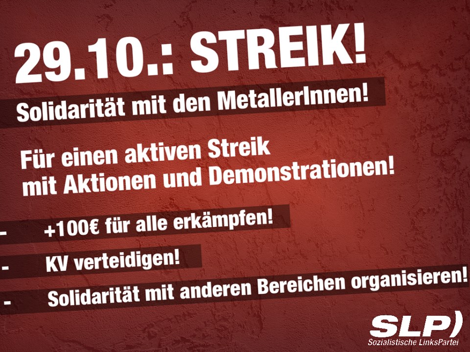 Die Gewerkschaft geht mit der Forderung nach + 100.- Euro aber min. + 3,4% in die Verhandlungen. Eine Forderung, die für viele KollegInnen als das untere Ende des Nötigen gesehen wird. Es ist gut, dass es schon eine Reihe von Mobilisierungen gegeben hat – Betriebsversammlungen und Betriebsrätekonferenzen sind wichtig, um KollegInnen zusammen zu bringen. Es ist absolut richtig, dass die Gewerkschaft nun einen Streik ansetzt und der unbefristet ab dem 29.10. geführt werden soll.