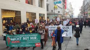 Denn gerade #Metoo zeigt wieder mal wie viele Frauen von sexueller Gewalt betroffen sind. Auch auf der Kundgebung berichteten Frauen über ihre Erfahrungen mit sexueller Belästigung bzw. nutzten Schilder und Plakate um auf verschiedene Aspekte aufmerksam zu machen. In mehreren Reden betonten AktivistInnen unter anderem von Aufbruch, der Sozialistische LinksPartei (SLP) und KOMintern, dass es einen breiten politischen Kampf gegen sexuelle Gewalt und alle anderen Formen von Frauenunterdrückung braucht, aber auch das dieser Kampf mit dem Kampf gegen Sozialabbau und Kapitalismus verbunden werden muss.