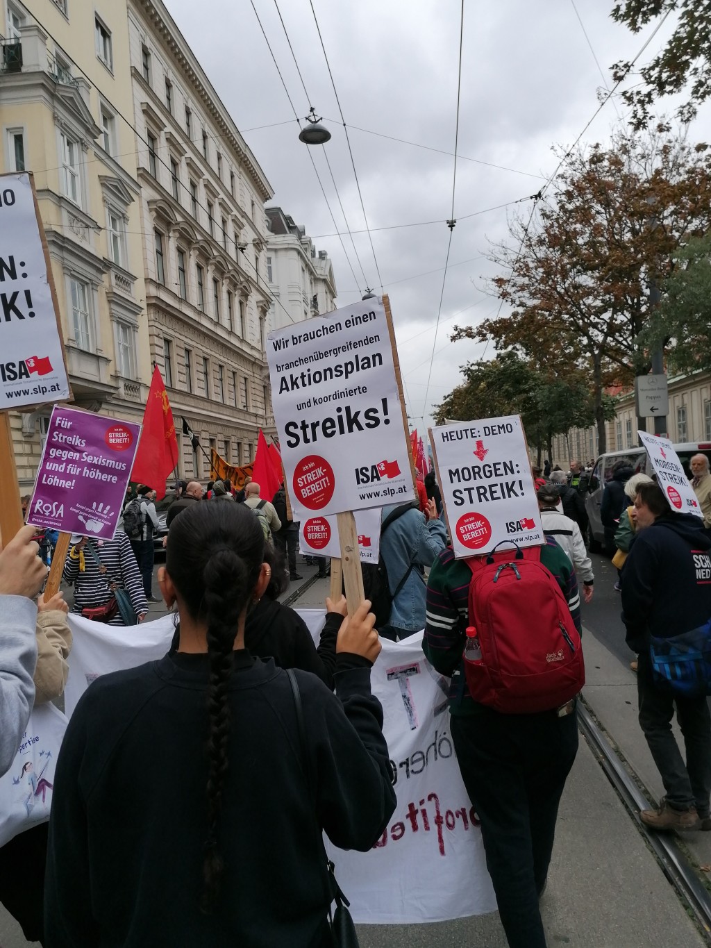 Sichtbar war, dass manche Fachgewerkschaften diese einseitige Orientierung auf Preise nicht mitgetragen haben. So hat die Vida extra Buttons und Taferln für die Demonstration produziert, die Preise runter UND Löhne rauf forderten. Und 2 Tage danach hat die Gewerkschaft pro-ge die Forderungen für die Metallindustrie übergeben: + 10,6%. Am selben Tag hat auch der private Sozialbereich (SWÖ) die Verhandlungen eingeleitet, demnächst folgt der Handel. und die Vida führt “Sonderverhandlungen” angesichts der Teuerung, also ein Vorziehen der jährlichen KV-Verhandlungen und fordert ein Plus von 500.-. Was aber fehlt, ist eine einheitliche Strategie, ein Zusammenführen der Forderungen, der Mobilisierung, der Planung und der Durchführung nicht nur der Verhandlungen, sondern auch von Arbeitskämpfen bis hin zu Streiks. Warum also wurden die Demonstrationen nicht als Startpunkt für + 10% für alle und mindestens 2.000.- netto genommen?