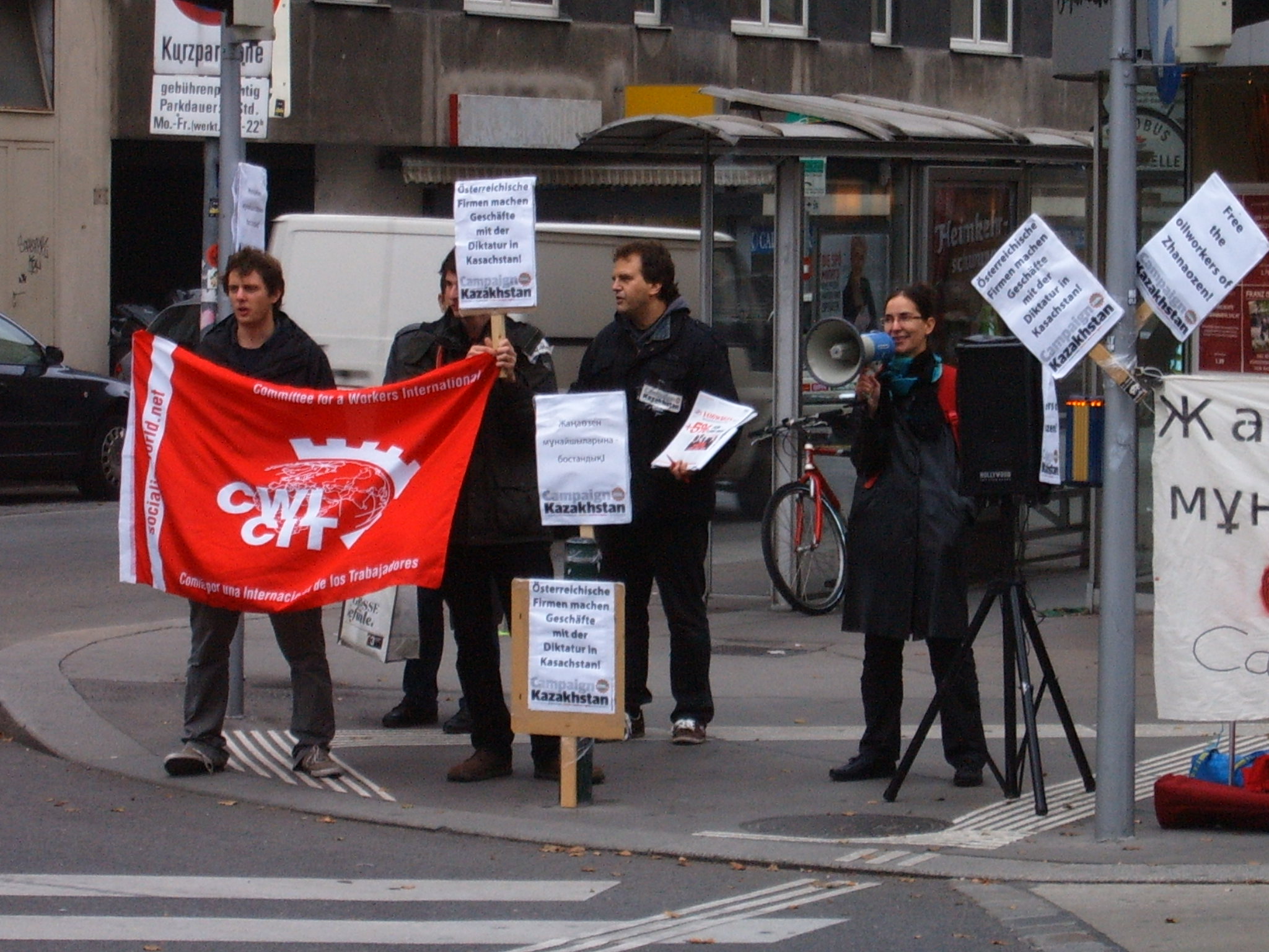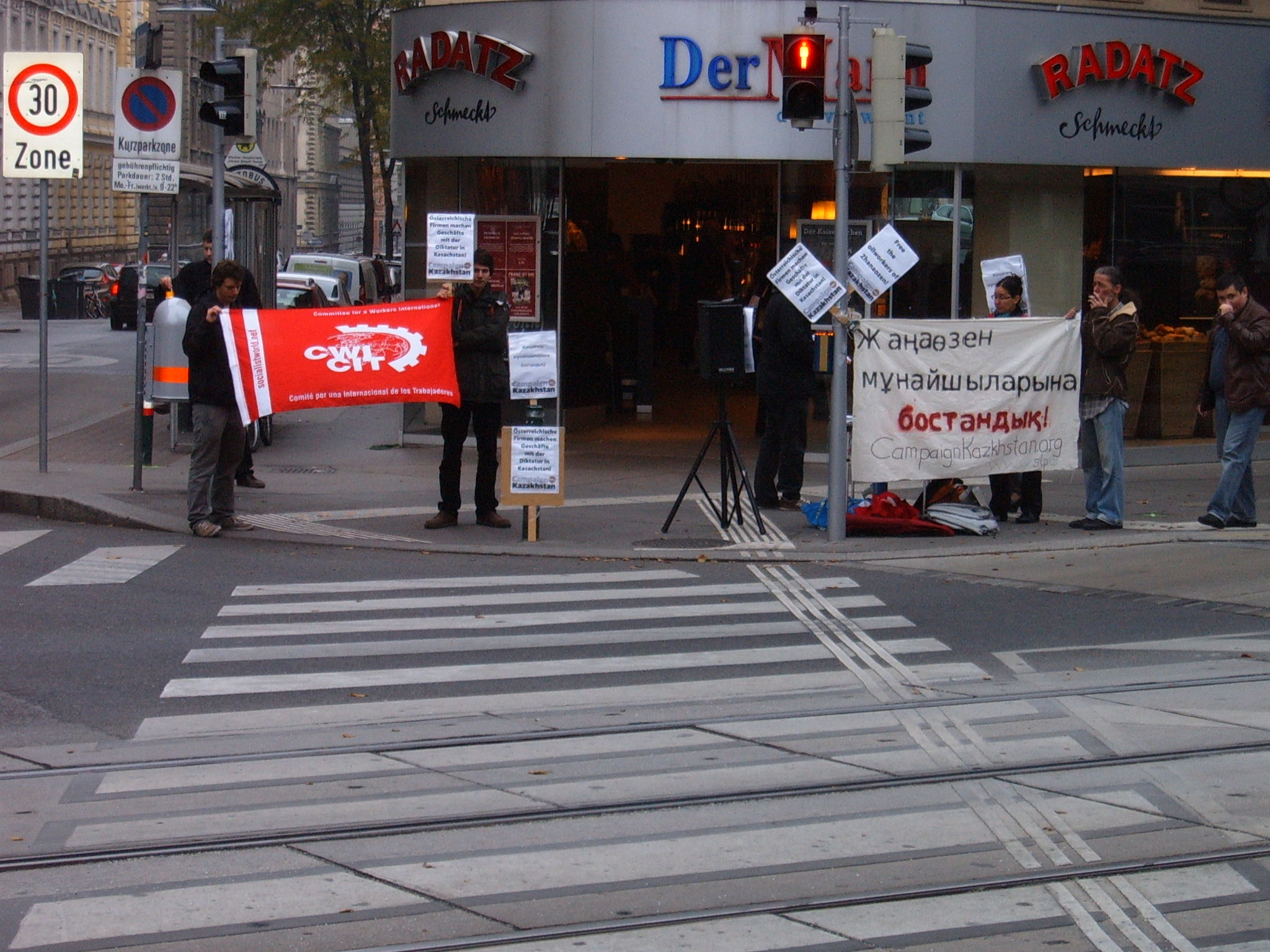 Doch Nasarbajews Spießrutenlauf ist noch nicht zu Ende: Am Dienstag findet in der Bundeswirtschaftskammer das große Angeln Kasachstans nach österreichischen Wirtschaftspartnern statt. Bis jetzt sind rund 50 heimische Unternehmen in Kasachstan aktiv, es sollen mehr werden. Immerhin ist Kasachstan für Österreich ein extrem wichtiger Handelspartner, va beim Öl. Doch die – großen und kleinen – KapitalistInnen, die sich auf lukrative Geschäfte freuen, werden damit konfrontiert, dass sie Geschäfte mit einer blutigen Diktatur machen. Es ist eine belebte Straße. Die Kundgebung der CampaignKazachstan, mit Tafeln in Deutsch, Englisch und Kasachisch und dem inzwischen „legendären“ Transparent (zu sehen beim Match Österreich-Kasachstan, im Präsidentschaftspalast und jetzt) sowie Megafon und Anlage zieht viel Aufmerksamkeit auf sich. Viele PassantInnen bleiben stehen, unterschreiben unsere Liste und gratulieren uns, bzw. bedanken sich für unsere Aktion. Einer spendiert uns allen eine Runde Cafe. Außer den Herren im Anzug, die offensichtlich auf dem Weg in die Bundeswirtschaftskammer sind findet eigentlich niemand gute Worte für Kasachstan und seinen Präsidenten.