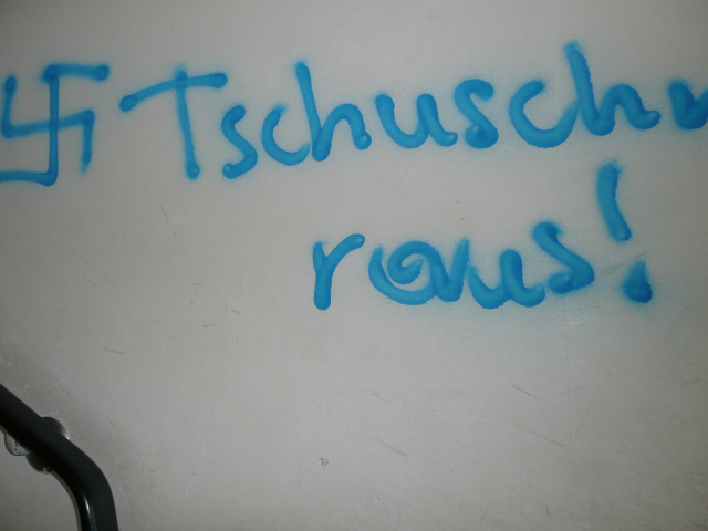 Der Terror der Naziszene hat in Wien einen neuen Level erreicht. In der Nacht von 23. auf 24. Februar 2008 wurde im Haus, in dem die Bundessprecherin der SLP, Sonja Grusch, gemeldet ist, Naziparolen gesprayed (siehe Foto). Das Haus wurde außerdem von außen "markiert". Weiters wurde in der unmittelbaren Nachbarschaft auf einer Hauwand beim Hannovermarkt ein Hakenkreuz sowie die Sprüche "Tschuschn raus" und "Heil Hitler" mit blauer Farbe gesprayed.