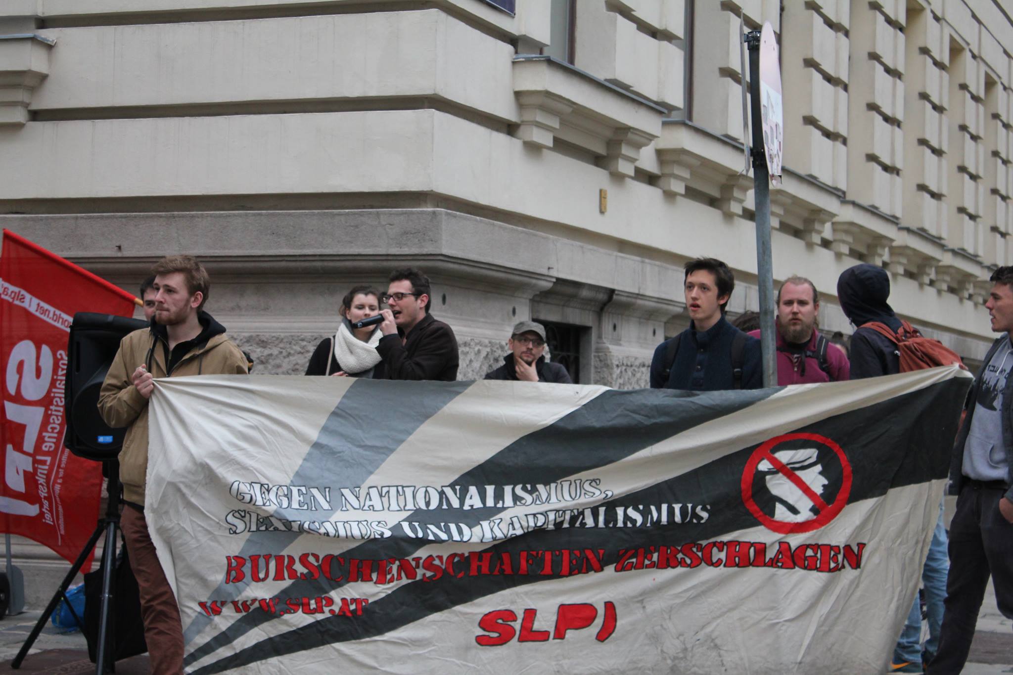 Auch wenn die Gruppe der AktivistInnen der Gegenaktion überschaubar war, war der Protest gegen die Geschichtsverfälscher der „Katholisch-Österreichischen Landmannschaft“ ein starkes Zeichen. Von der SLP redeten fünf AktivistInnen, für zwei war es das erste Mal – weiter so!
