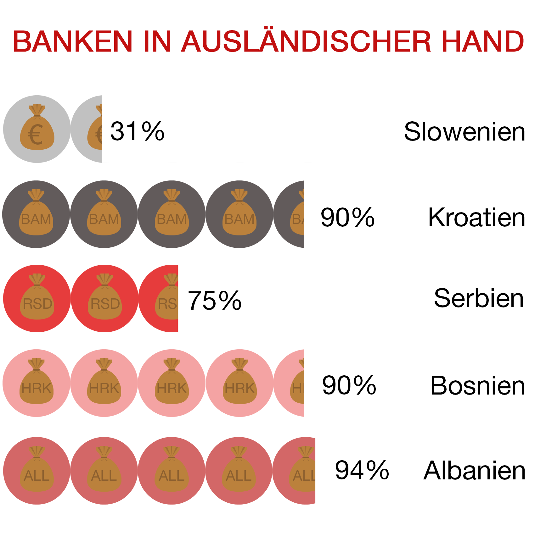 Österreichische Banken halten 85% des Finanzsektors in Bosnien-Herzegowina. Die Raiffeisenbank hat einen Marktanteil von ca. 30%, gefolgt von der Ersten Group mit ca. 8%. Es wird aber nicht in die Wirtschaft investiert, sondern v.a. Kredite vergeben.