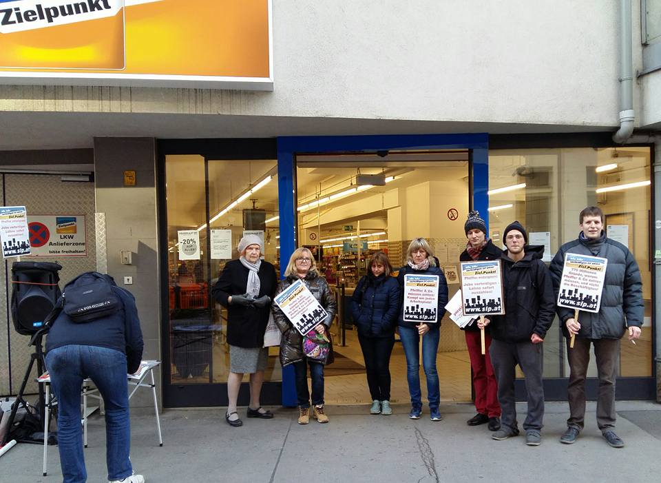 Am Freitag den 11.12. haben AktivistInnen der SLP gemeinsam mit KollegInnen und KundInnen der Zielpunkt-Filiale Wien Marxergasse eine erfolgreiche Protestkundgebung abgehalten. In Reden forderten wir den Erhalt der Arbeitsplätze und die Auszahlung der Gehälter, zahlreiche PassantInnen zeigten sich solidarisch und unterschrieben unsere Petition für kämpferische Gewerkschaftsmaßnahmen. Besonders gefreut hat uns, dass ältere KundInnen extra für die Aktion gekommen sind. Sie machten klar, dass sie auf der Seite der Beschäftigten stehen. Die Zielpunkt-Filiale ist der einzige Supermarkt im Grätzel und somit für ältere und andere weniger mobile AnrainerInnen absolut notwendig, um Einkäufe erledigen zu können. Eine Verwandlung der Filiale in einen Spar oder Billa würde außerdem vor allem PensionistInnen vor finanzielle Probleme stellen, da die Produkte dort um einiges teurer sind.
