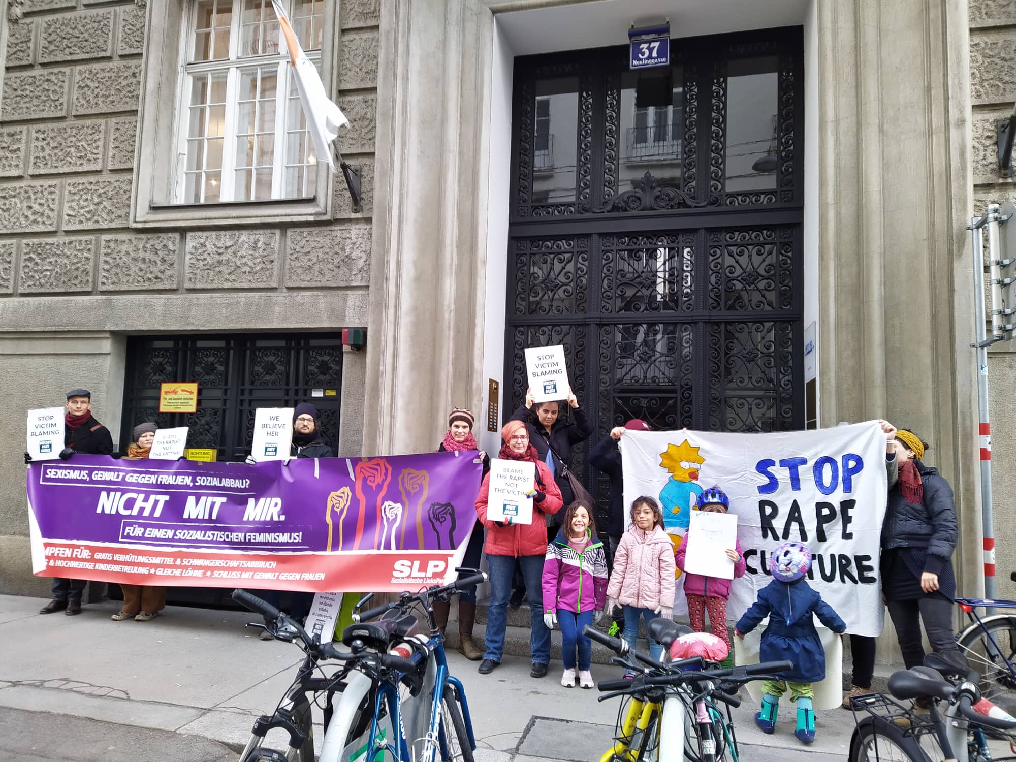 Am 13. Jänner 2020 organisierten Aktivist*innen der feministischen sozialistischen Initiative „Nicht mit mir“ eine spontane Protestaktion vor der zypriotischen Botschaft in Wien. Anlass war ein unfassbares Urteil gegen eine junge Frau. Nachdem sie im Sommer 2019 Opfer einer Gruppenvergewaltigung wurde, folgte eine unglaubliche Täter-Opfer-Umkehr durch die Ermittlungsbehörden und die Justiz. Die Frau wurde Anfang Jänner wegen „Erregung öffentlichen Ärgernisses“ zu einer bedingten Haftstrafe von vier Monaten verurteilt. Aufgrund intensiver Proteste vor Ort und internationaler Solidarität konnte sie inzwischen zumindest das Land verlassen. Dieser Fall zeigt einmal mehr, dass sexuelle Gewalt gegen Frauen* ein strukturelles, weltweites und allgegenwärtiges Problem ist. Gemeinsam mit solidarischen Aktivist*innen verteilten wir Flyer mit Informationen zum Fall an Passant*innen und zeigten unsere Solidarität der Betroffenen in diesem Fall und mit allen Frauen*, die von sexueller Gewalt betroffen sind oder waren. In einigen kurzen Reden machten die Aktivist*innen zudem klar, dass Sexismus, Frauen*feindlichkeit und Antifeminismus unmittelbar mit dem kapitalistischen System zusammenhängen und ein Kampf für Frauen*befreiung immer antikapitalistisch und international sein muss. Trotz der Kurzfristigkeit sind dem Aufruf zum Protest einige Leute gefolgt, die nicht nur Interesse an dem konkreten Fall, sondern auch an unserer politischen Arbeit gezeigt haben.