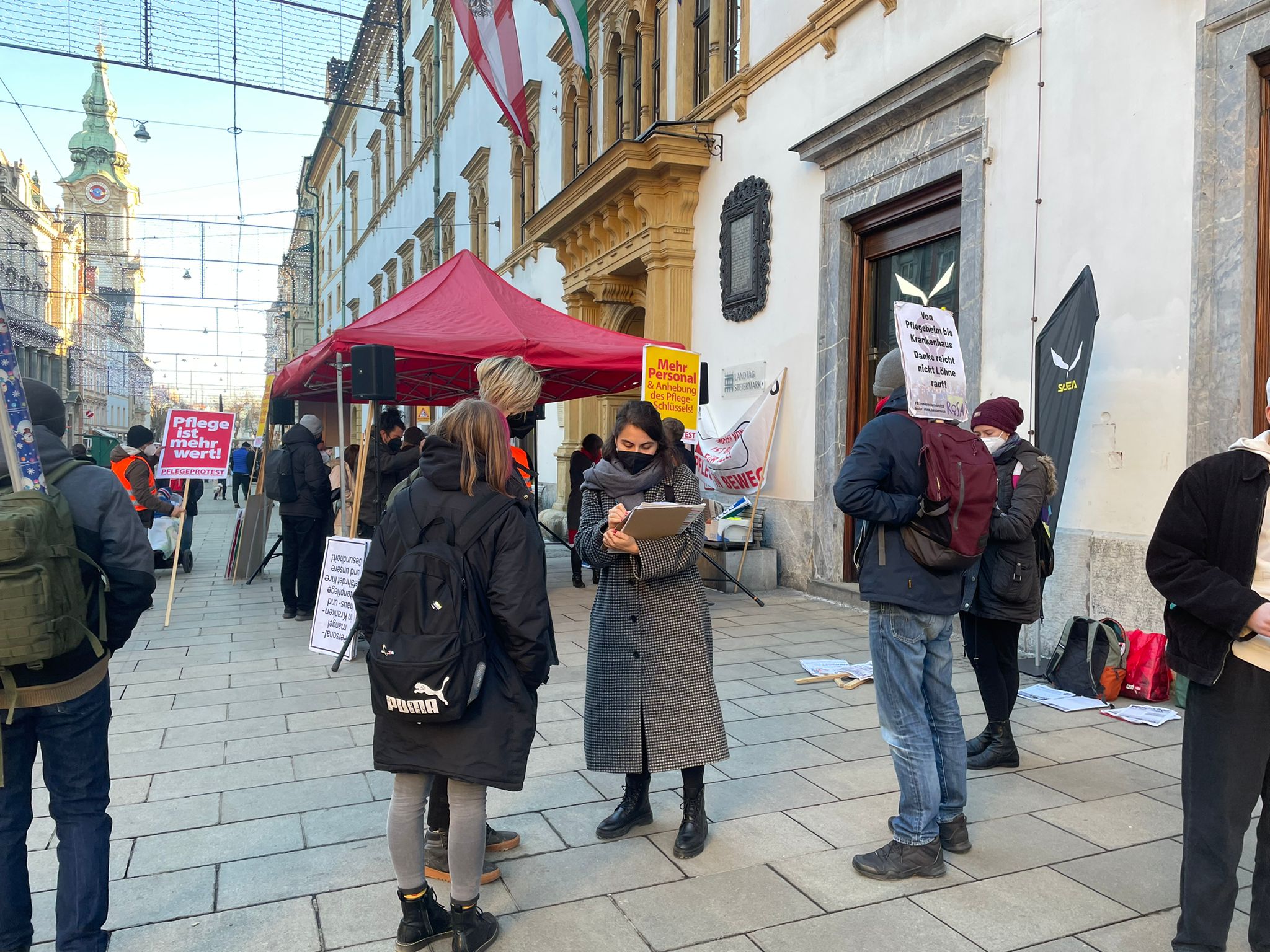 „Es ist 15 nach 12!“, so könnte man die momentane Situation in der Pflege beschreiben. Schon vor der Pandemie waren die Arbeitsbedingungen miserabel. 2 Jahre später hatten sich die zahlreichen Missstände, insbesondere durch Corona, um ein Vielfaches verstärkt. Der anfängliche Applaus ist schnell verblasst, übrig blieben nur Frustration und Ernüchterungen bei vielen Beschäftigten. Nun scheint sich diese Wut jedoch im ganzen Land in Widerstand zu verwandeln: Letzte Woche protestierten Linzer Pflegekräfte für mehr Mittel für die Pflege im oberösterreichischen Landesbudget. In Salzburg gingen rund 2.500 Pflegekräfte für „faire Arbeitsbedingungen“ auf die Straße. Hunderte Pfleger*innen in der Steiermark und OÖ legten vergangenen Mittwoch für einige Minuten ihre Arbeit nieder und stellten sich vor die Tore ihrer Einrichtungen, um zu signalisieren, dass es so nicht weitergehen kann!